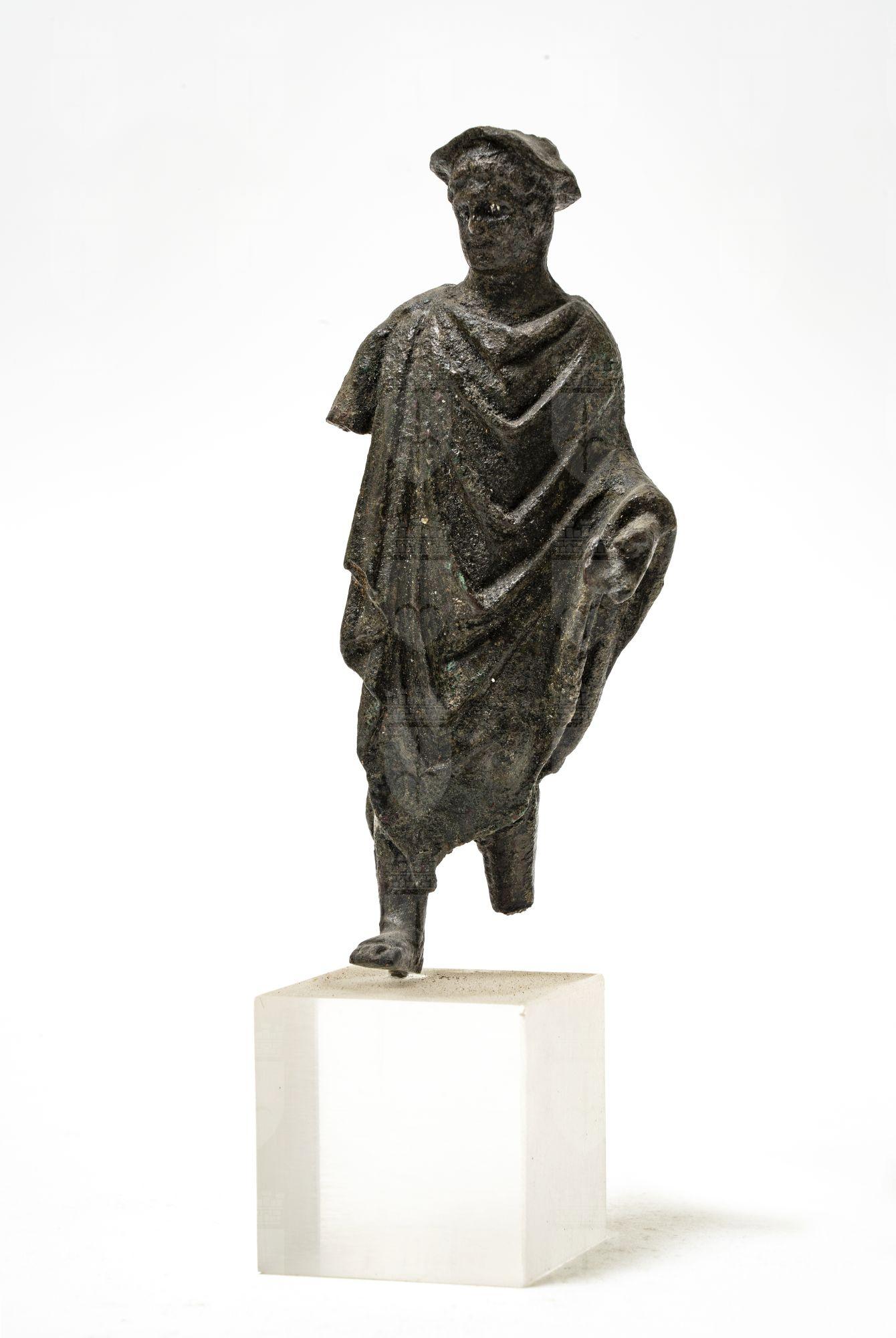 Statuetta di Mercurio. Originariamente reggeva gli attributi che di solito lo caratterizzano. Il capo è coperto dal pètaso, sul quale è visibile una tacca nel punto in cui si impostavano le alette. Il corpo è quasi interamente avvolto da un lungo mantello, da cui spunta solo la mano sinistra. I piedi nudi accennano un passo. Il viso, dai tratti poco riconoscibili, è lievemente reclino verso destra. I capelli corti si dispongono a frangetta sulla fronte.