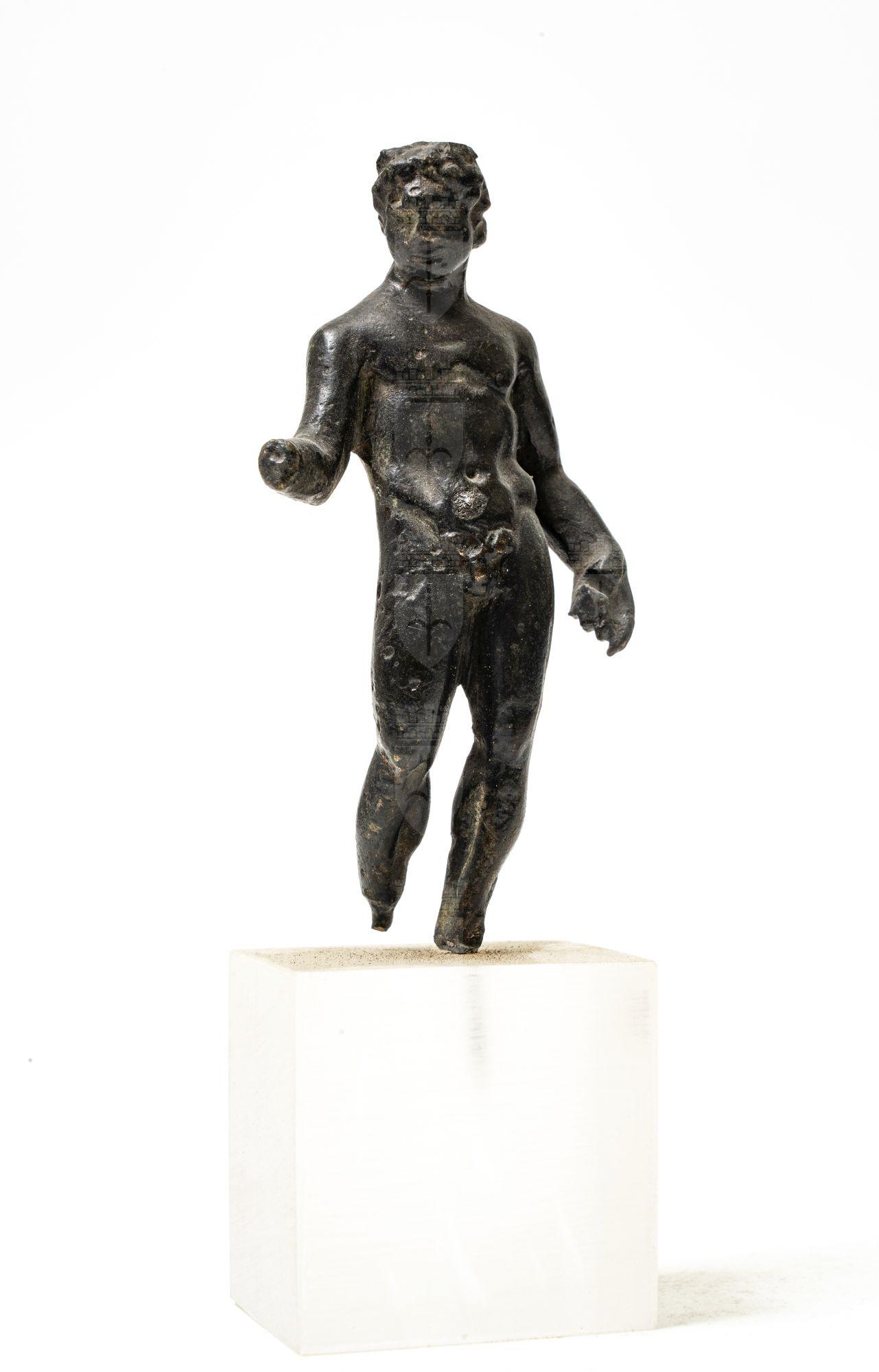 Figura di Mercurio, identificabile grazie alla posizione delle braccia, diffuso soprattutto in Gallia (che reggeva la borsa con la mano destra e il caduceo con la sinistra). La gamba sinistra sorregge il peso de corpo, la destra è lievemente flessa è arretrata. Il braccio destro è piegato e proteso verso destra, il sinistro abbassato e scostato dal corpo. Il volto è girato verso destra e lievemente reclino. La capigliatura ricciuta forma un rotolo orizzontale sulla nuca.