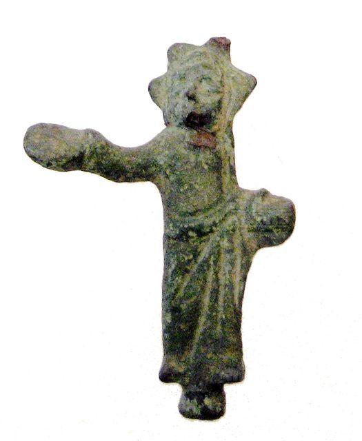 Figurina maschile arcaica, ammantata inferiormente, con diadema a 4 punte dietro alla testa, portante una patera nella mano destra protesa. Piatta posteriormente.