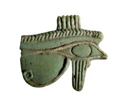Amuleto bidimensionale in faience raffigurante il cosiddetto Udjat, o "occhio di Horus", mediante incisione su una sola delle due facce: l'occhio, di cui è evidente il contorno allungato dal trucco e l'iride priva di pupilla, è sormontato dal sopracciglio campito a tratteggio, mentre al di sotto ha due elementi decorativi, uno verticale rigato e l'altro obliquo e terminante a ricciolo. Lo spazio tra occhio e sopracciglio, così come quello tra l'occhio e il ricciolo sottostante, solo pieni, mentre il resto del contorno dell'amuleto segue la forma dell'occhio. In cima è presente una presa forata per la sospensione. L'amuleto udjat, che garantiva buona salute, era forse il più popolare dell'antico Egitto, a causa del mito della disputa di Horus e Seth, in cui l'occhio che Horus perde durante il combattimento fu risanato dal dio Thot.