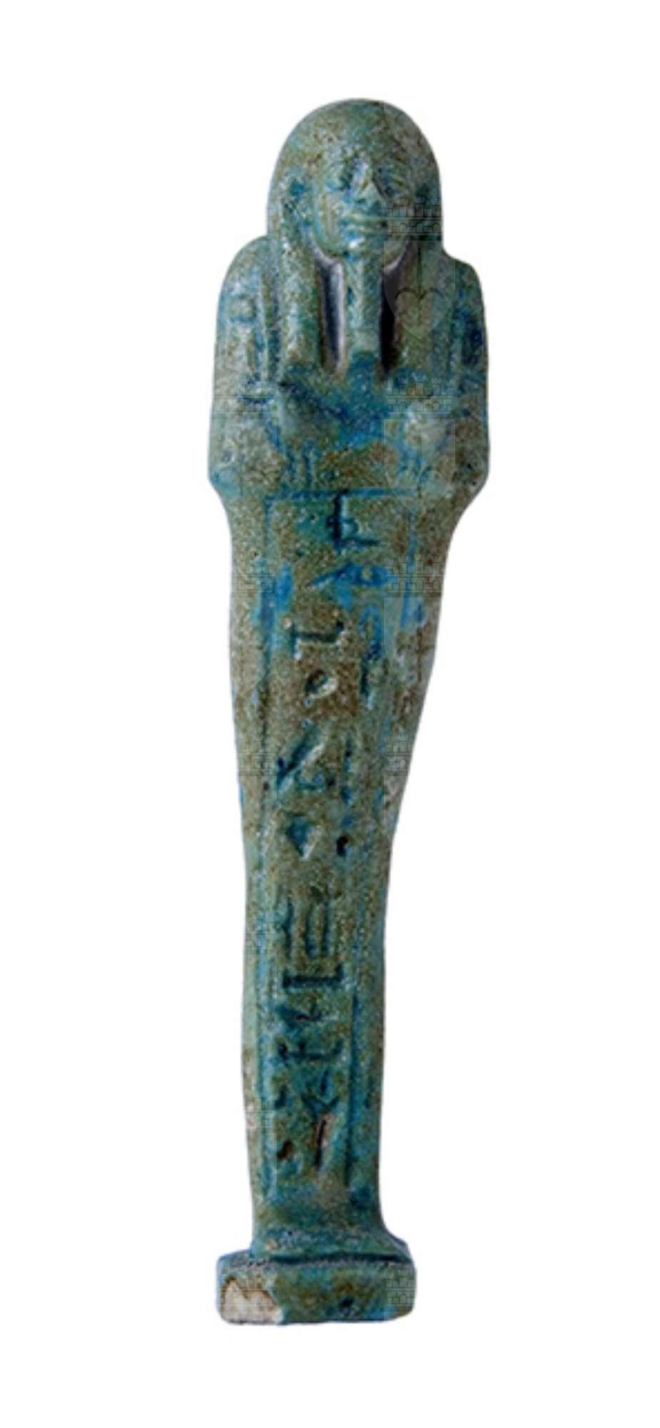 Statuina funeraria mummiforme che indossa una parrucca tripartita, che dietro continua direttamente con il pilastro dorsale, e la barba divina intrecciata. Le mani incrociate tengono ognuna una zappa. Dietro la spalla sinistra pende una sacca. Sotto i piedi è presente una piccola base, che forma un tutt’uno con il pilastro dorsale. L’iscrizione, sul davanti delle gambe, comprende solo il nome del defunto e della madre, scritti in un’unica colonna.