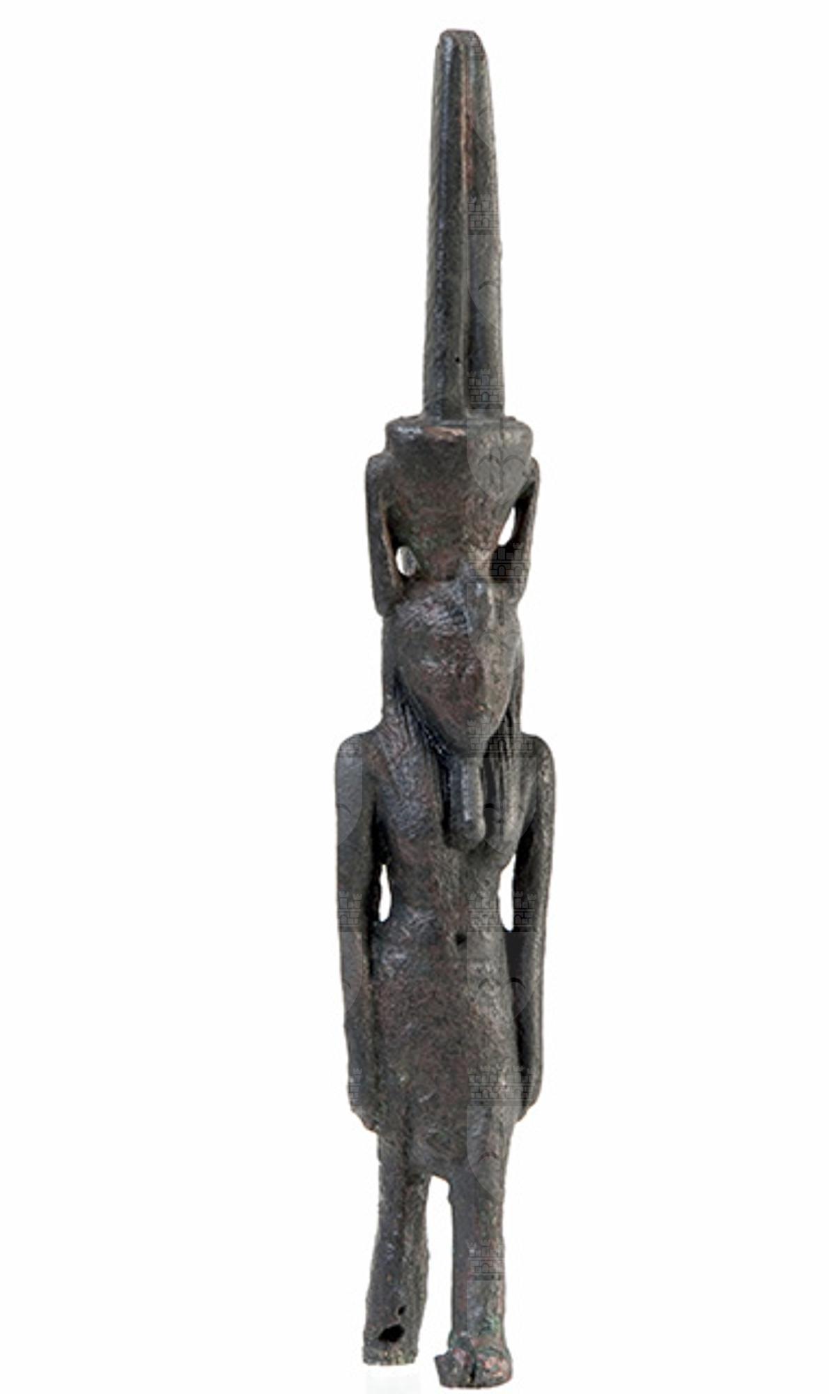 Figurina filiforme del dio Nefertum in bronzo, divinità legata al profumo ed al fiore del loto azzurro. Manca della parte inferiore delle gambe. Il dio è raffigurato nell’atto di camminare con le braccia lungo i fianchi. Indossa un corto gonnellino pieghettato (lo shendit), la parrucca tripartita con un ureo sulla fronte e la lunga barba divina. Sul capo ha il suo tipico diadema: un fiore di loto da cui spuntano due alte piume diritte. Dietro il collo si vede ciò che resta dell'anello di sospensione.
