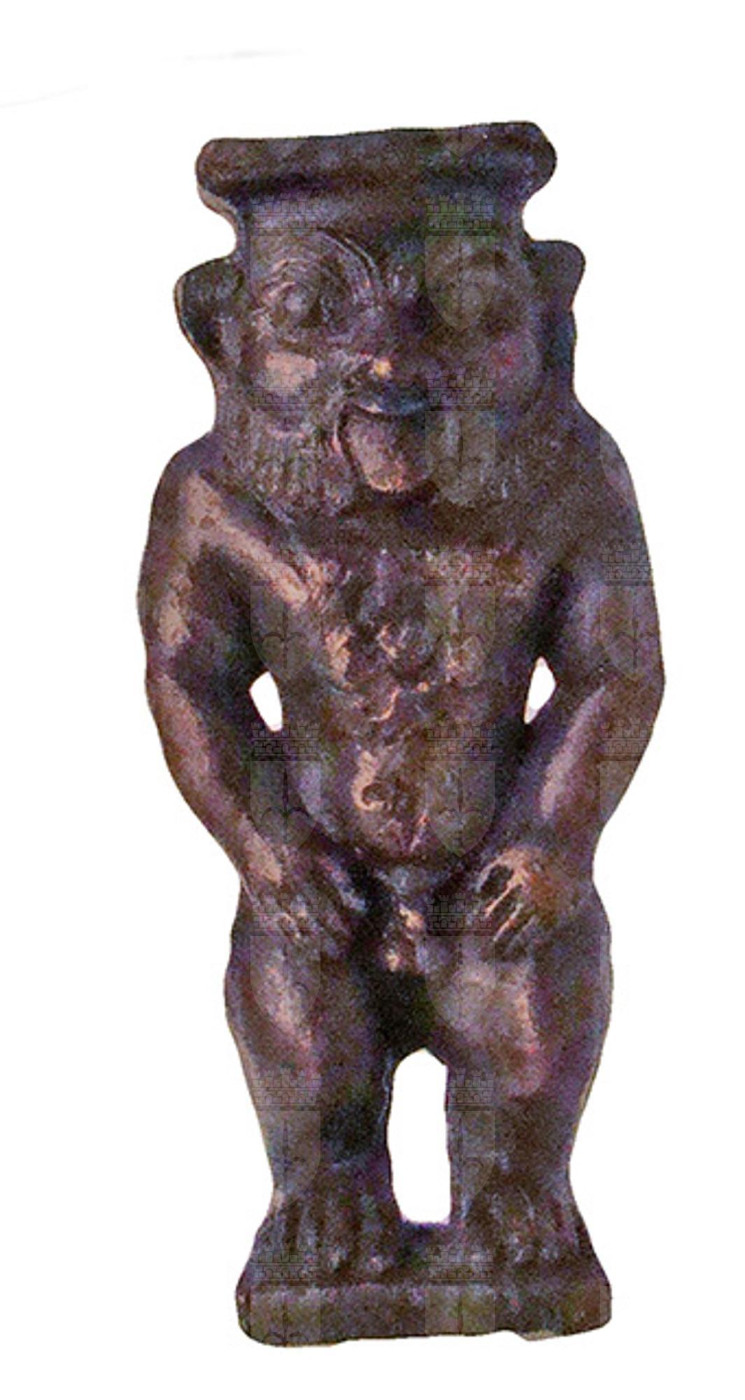 La statuetta è stata eseguita a fusione piena, utilizzando uno stampo monovalve: la parte posteriore, infatti, non è lavorata a rilievo bensì leggermente incavata. Raffigura il dio nano Bes, ritratto nudo, stante, con le braccia appoggiate sui fianchi e i piedi che poggiano su una piccola base quadrata (sotto la quale vi è un perno quadrangolare anch’esso). Al collo porta un pettorale con disco solare. Il volto è, come di norma, grottesco: sopracciglia folte e unite, naso grande e piatto, bocca aperta con la lingua a penzoloni e barba ispida. Sulla testa ha la base del suo tipico diadema, il quale doveva essere completato dalla corona di piume di struzzo, che in questo caso è assente.