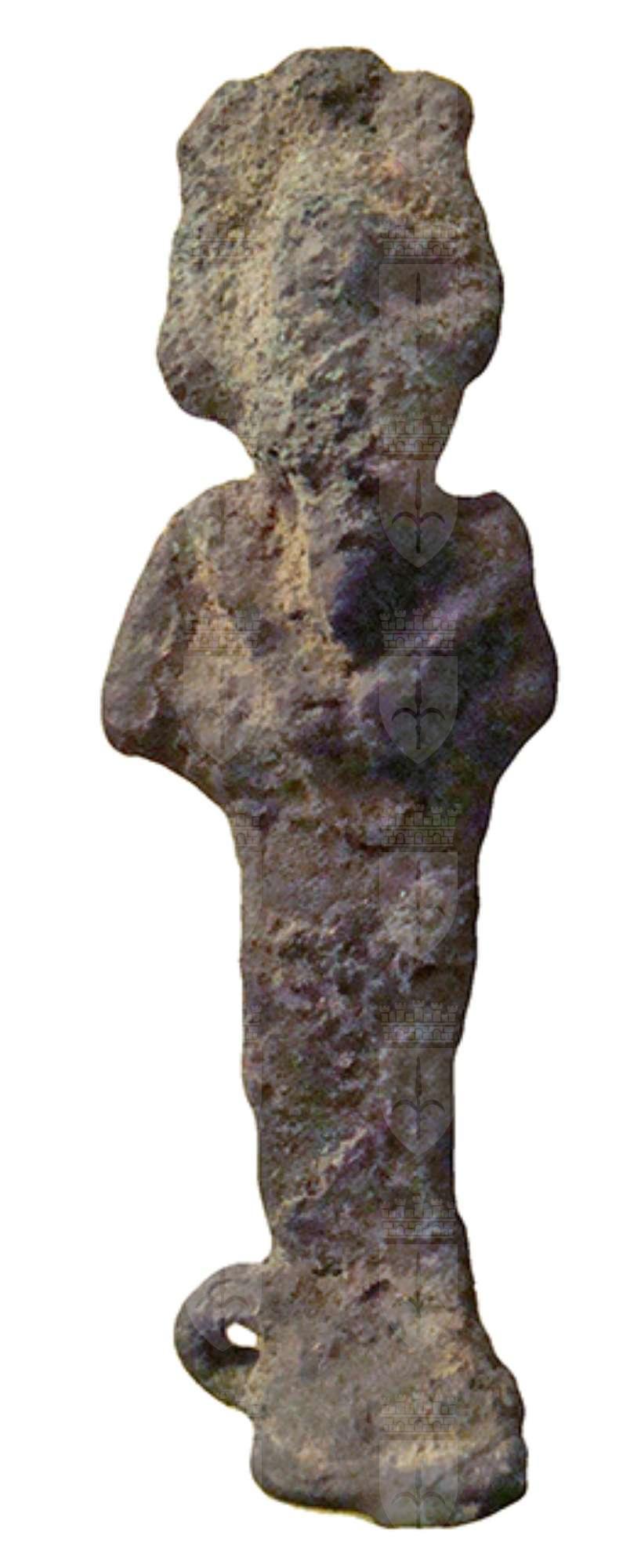 Amuleto in bronzo raffigurante il dio Osiride. Secondo la consueta iconografia, il dio è raffigurato stante, con il corpo mummiforme da cui escono solo le mani, che reggono scettro e flagello, e la testa, sulla quale vi è la corona atef. Non si distingue granché, ma al mento vi è la solita barba divina posticcia. Dietro la schiena e in corrispondenza delle caviglie, sul lato destro, vi sono due anelli di sospensione.