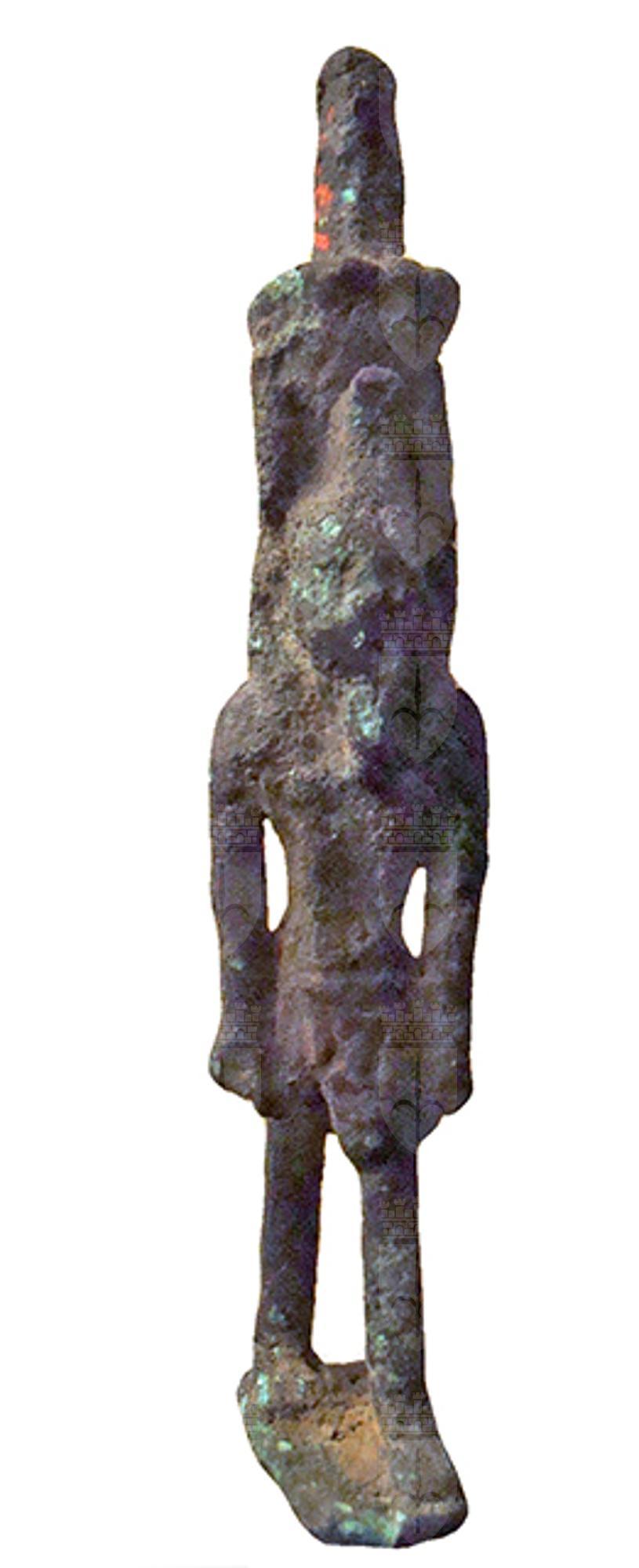 Figurina filiforme del dio Nefertum in bronzo, divinità legata al profumo ed al fiore del loto azzurro. Il dio è raffigurato nell’atto di camminare con le braccia lungo i fianchi. Indossa un corto gonnellino pieghettato (lo shendit), la parrucca tripartita con un ureo sulla fronte e la lunga barba divina. Sul capo ha il suo tipico diadema: un fiore di loto da cui spuntano due alte piume diritte, sul cui retro vi è un anello di sospensione. I piedi poggiano su una piccola base.