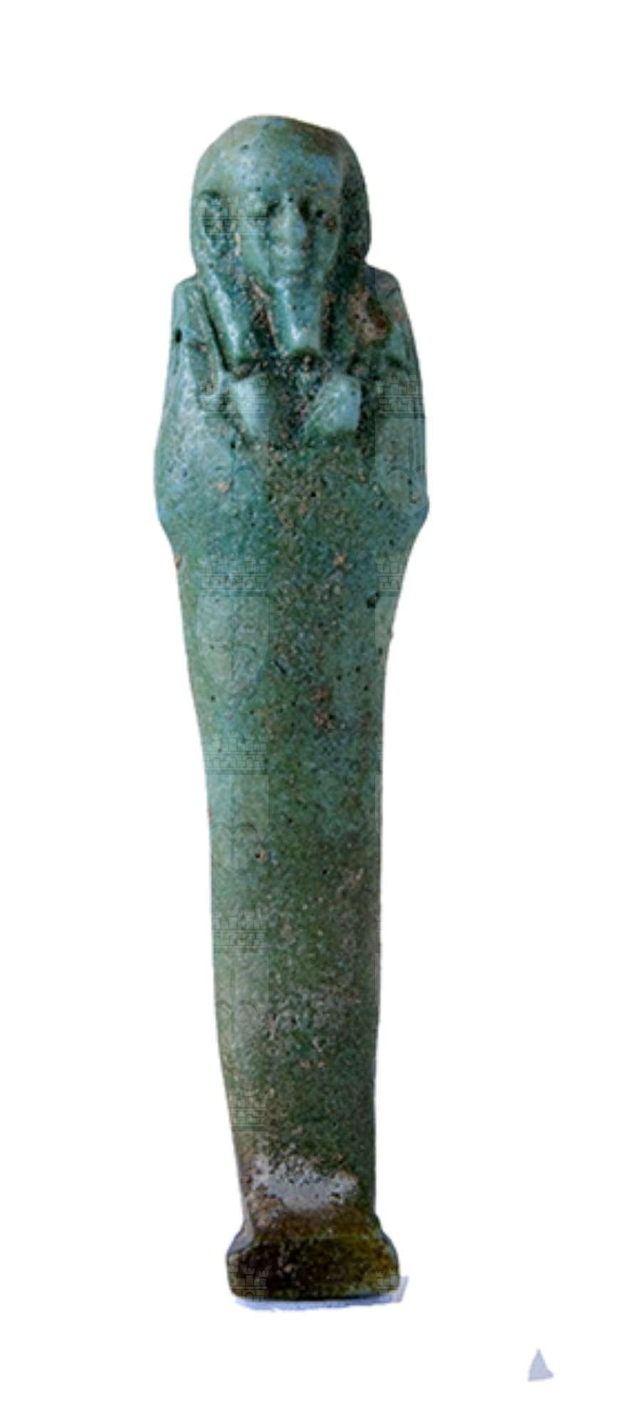 Statuina funeraria mummiforme che indossa una parrucca tripartita, la quale continua dietro direttamente con il pilastro dorsale, e la barba divina. Le mani opposte incrociate tengono ognuna una zappa. Dalla spalla sinistra pende una sacca. I piedi, appena accennati, poggiano su una piccola base. L’ushabti è privo di iscrizioni.