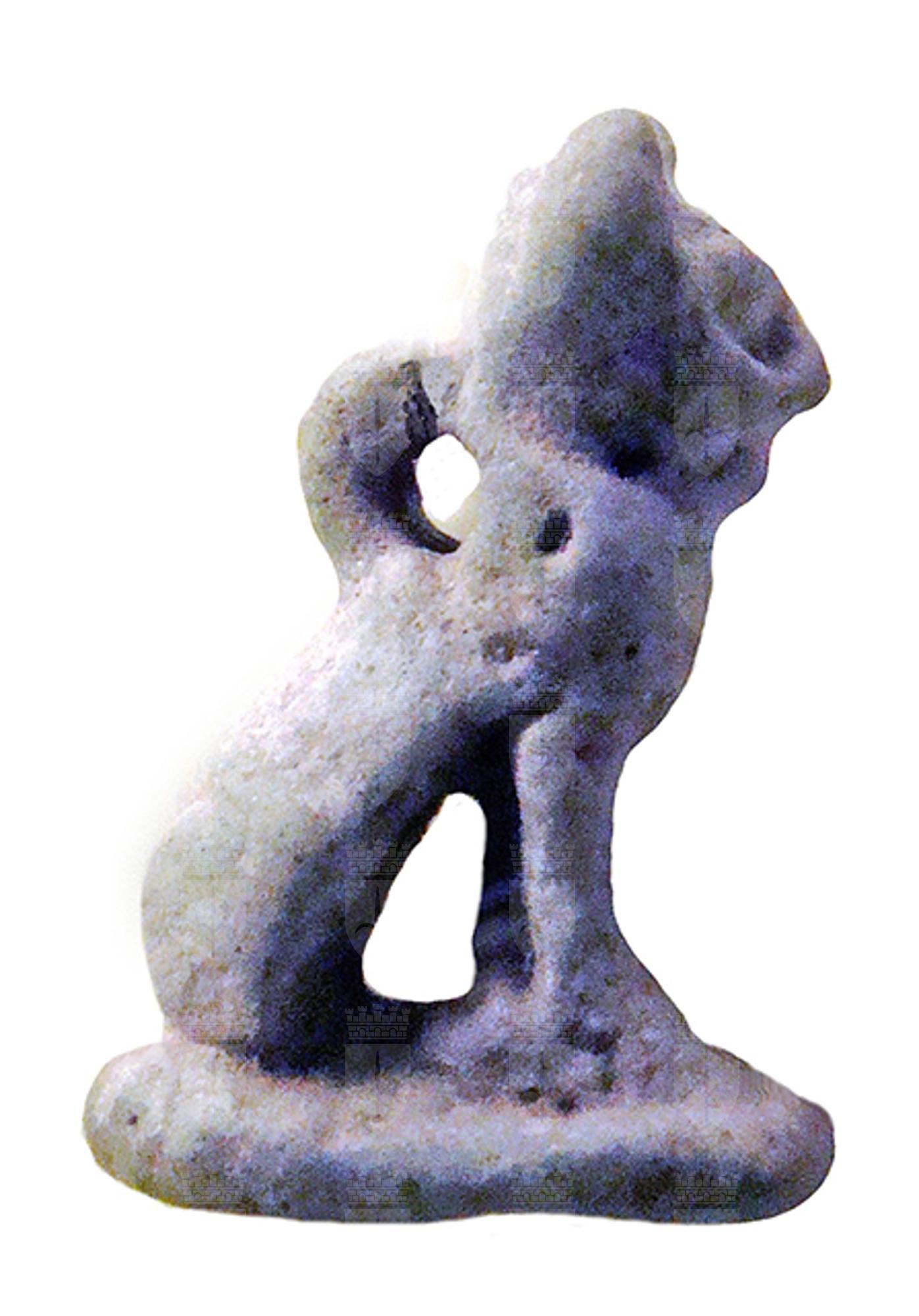 Amuleto in faience lavorato a tutto tondo, raffigurante un gatto seduto su una piccola base. Dietro al collo vi è un anello di sospensione.