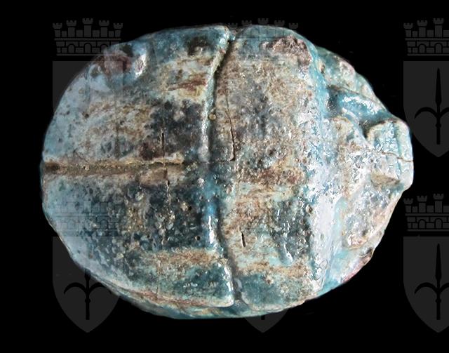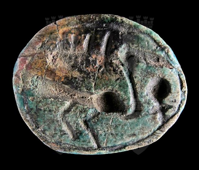 Scarabeo in steatite invetriata turchese con sul ventre una incisione crittografata del nome di Amon-Ra con anatra, segno men e geroglifico ankh. Questa, come le seguenti crittografie in cui compare un’anatra, mancano del consueto segno della piuma. Dorso con clipeo ed incisione a T che separa protorace ed elitre. Foro passante longitudinale.