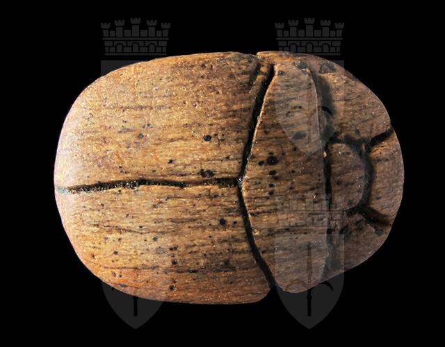 Scarabeo in steatite marrone con sul ventre crittografia del nome di Amon-Ra. Dorso con clipeo; protorace ed elitre separati da incisione a T. Foro passante longitudinale.