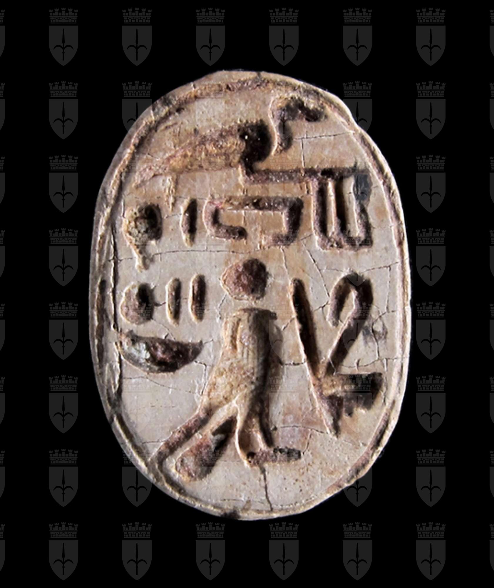 Scarabeo in steatite grigia; sul ventre incisione con segni geroglifici che costituiscono una formula non interpretabile con sicurezza. Dorso con clipeo e incisione a T che separa protorace ed elitre, le quali presentano tacche a V; sui lati si vedono le zampe ripiegate. Foro passante longitudinale.