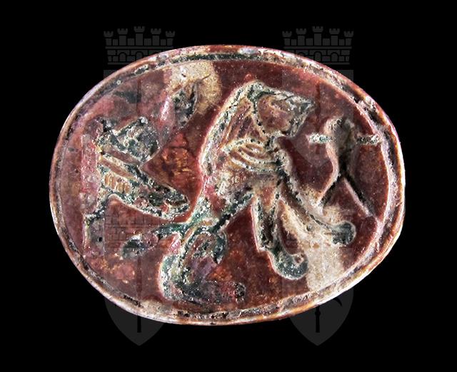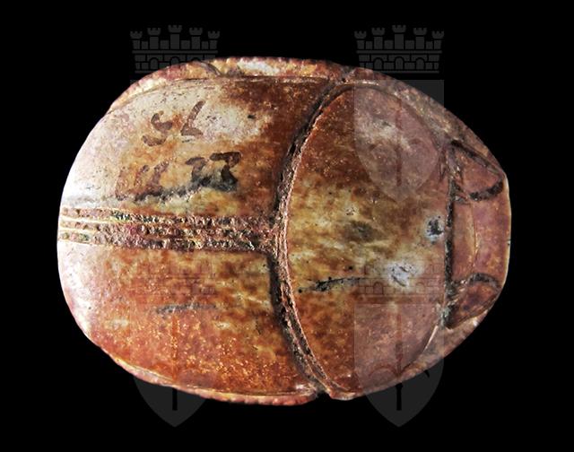 Scarabeo in steatite marrone con sul ventre incisione che rappresenta al centro un leone seduto, a sinistra un cobra alato e a destra il segno geroglifico che significa “protezione”. Dorso con incisione a T che divide il protorace e le elitre, clipeo stilizzato. Foro passante longitudinale.