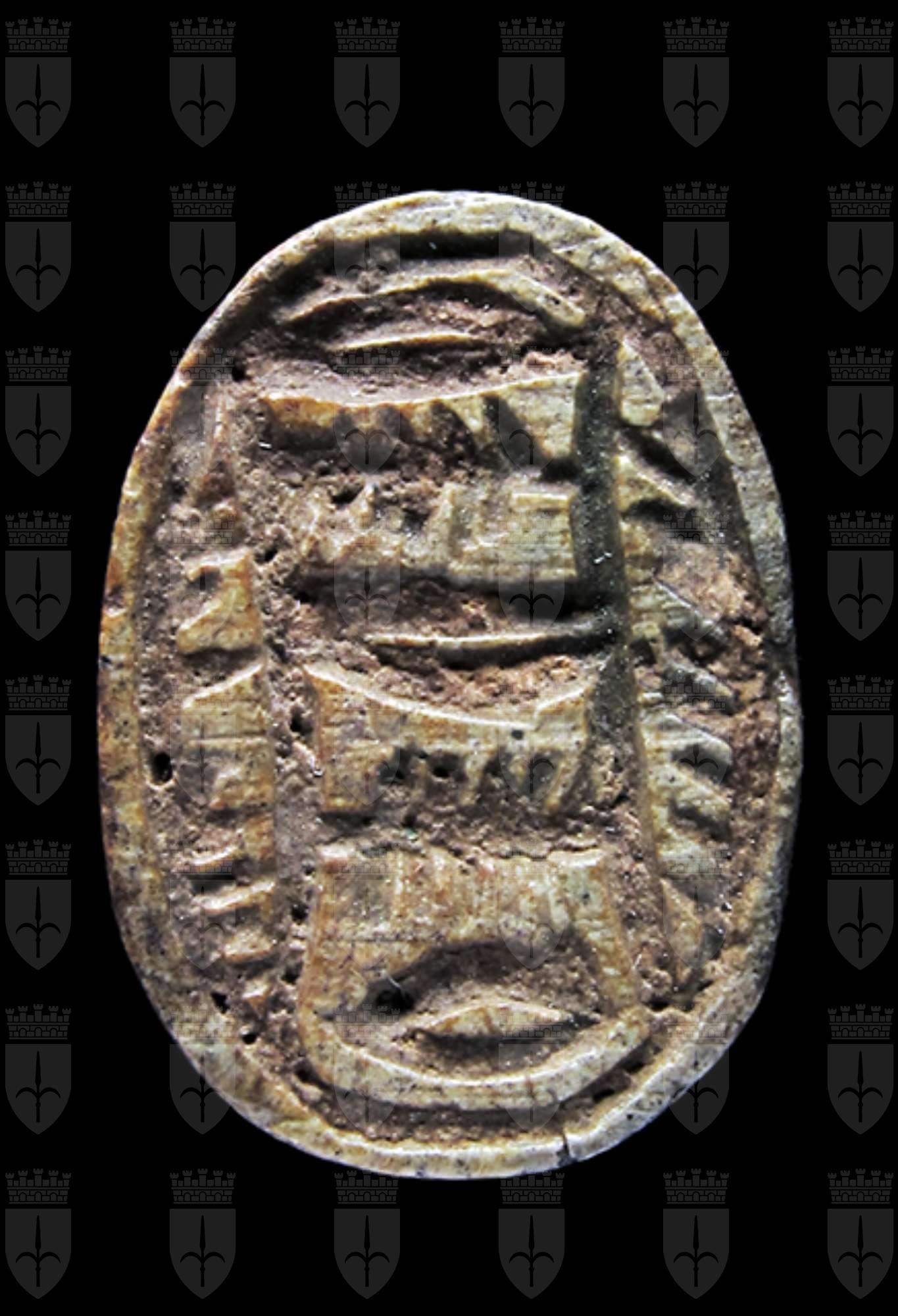 Scarabeo in steatite grigia con sul ventre una incisione, su una colonna affiancata da due segni neb, dello schema decorativo “a-n-r”. Dorso molto semplice, con incisione a V del clipeo e piccole tacche laterali all’altezza del protorace. Foro passante longitudinale.