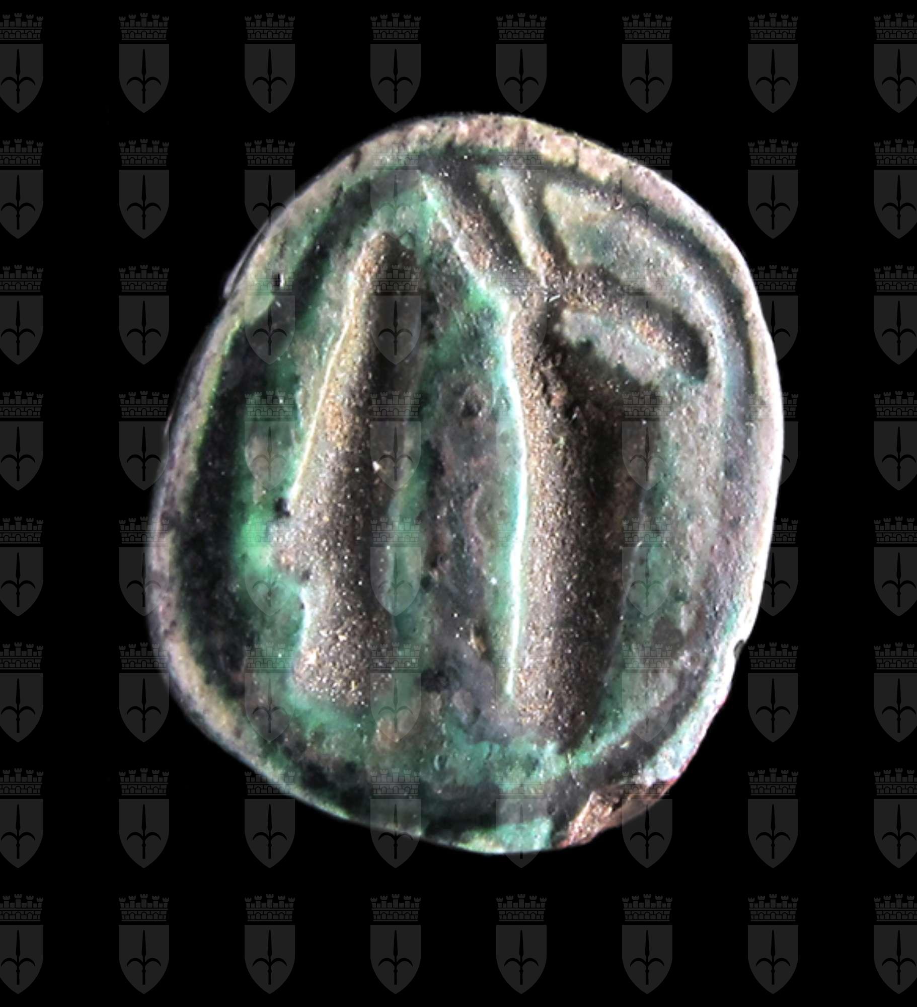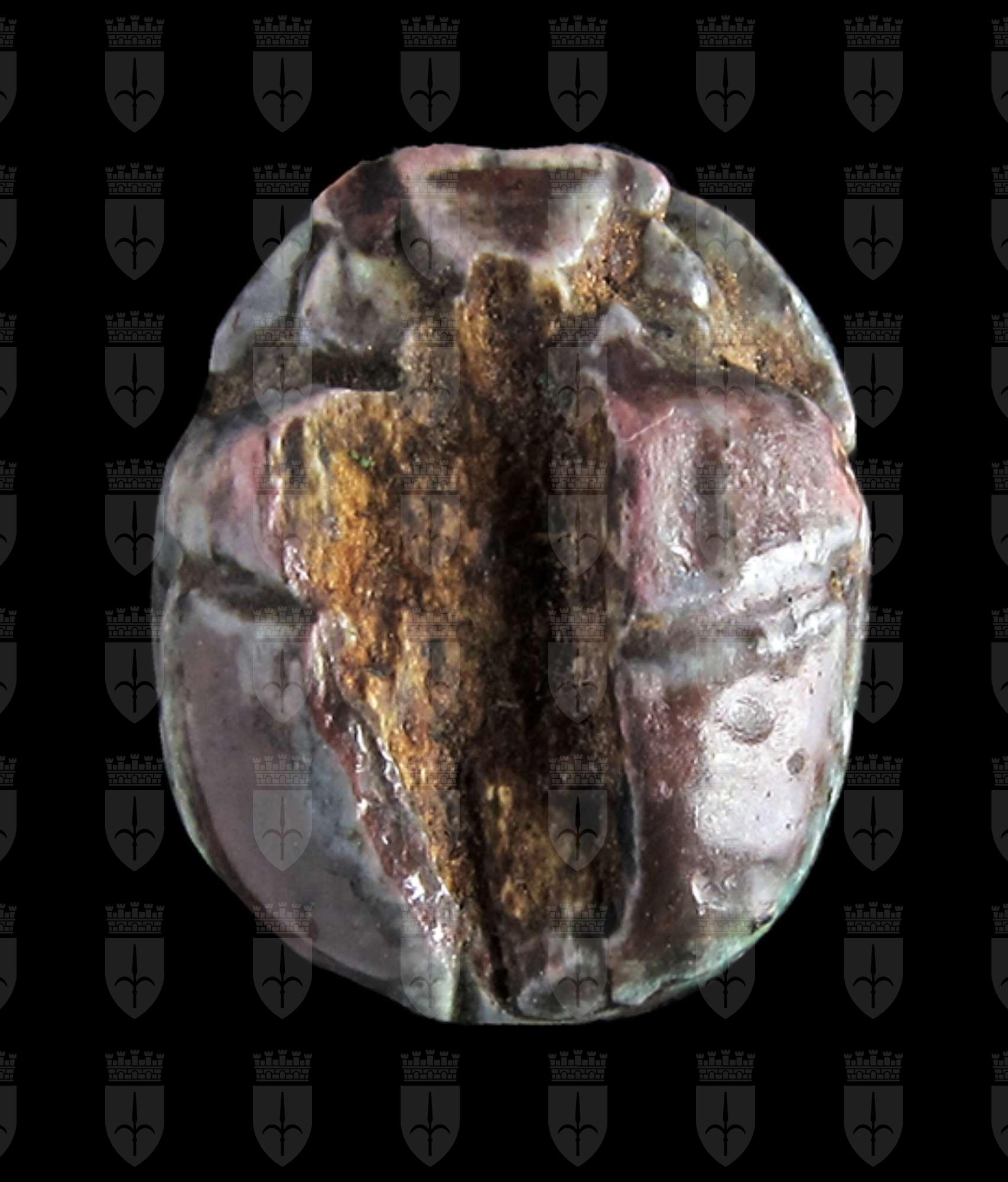 Scarabeo in steatite invetriata turchese; sul ventre si vedono una piuma ed un ureo racchiusi entro un ovale. Il dorso è danneggiato, ma si vedono comunque il clipeo e la divisione di elitre e protorace. Foro passante longitudinale.
