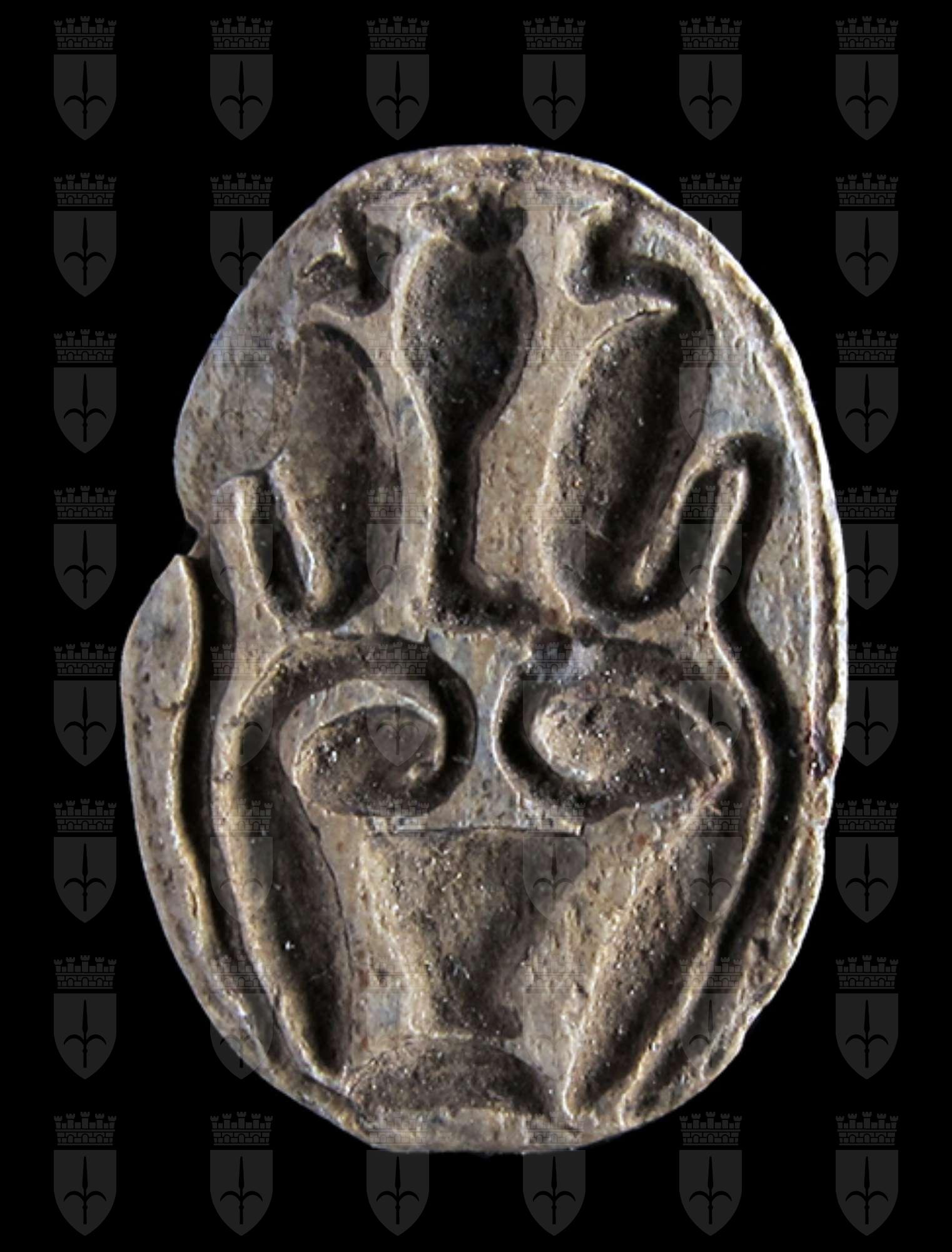 Scarabeo in steatite grigia, con sul ventre incisione di segni geroglifici disposti simmetricamente: si riconoscono due urei con lunga coda ai lati di un vaso hes. Dorso con clipeo ed incisione a T che divide il protorace dalle elitre. Foro passante longitudinale.