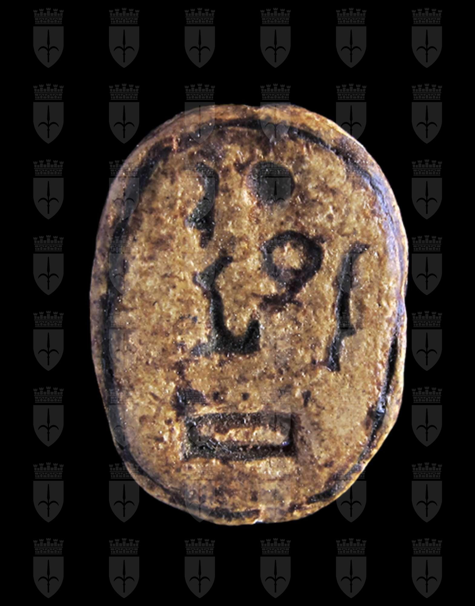 Scarabeo in steatite grigiastra con sul ventre incisione di segni geroglifici, molto consumati, all’interno di una cornice ovale; si possono interpretare come Men-maat-ra, prenome di Sethi I. Dorso con clipeo sulla testa e incisione a T che separa il protorace dalle elitre. Foro passante longitudinale.