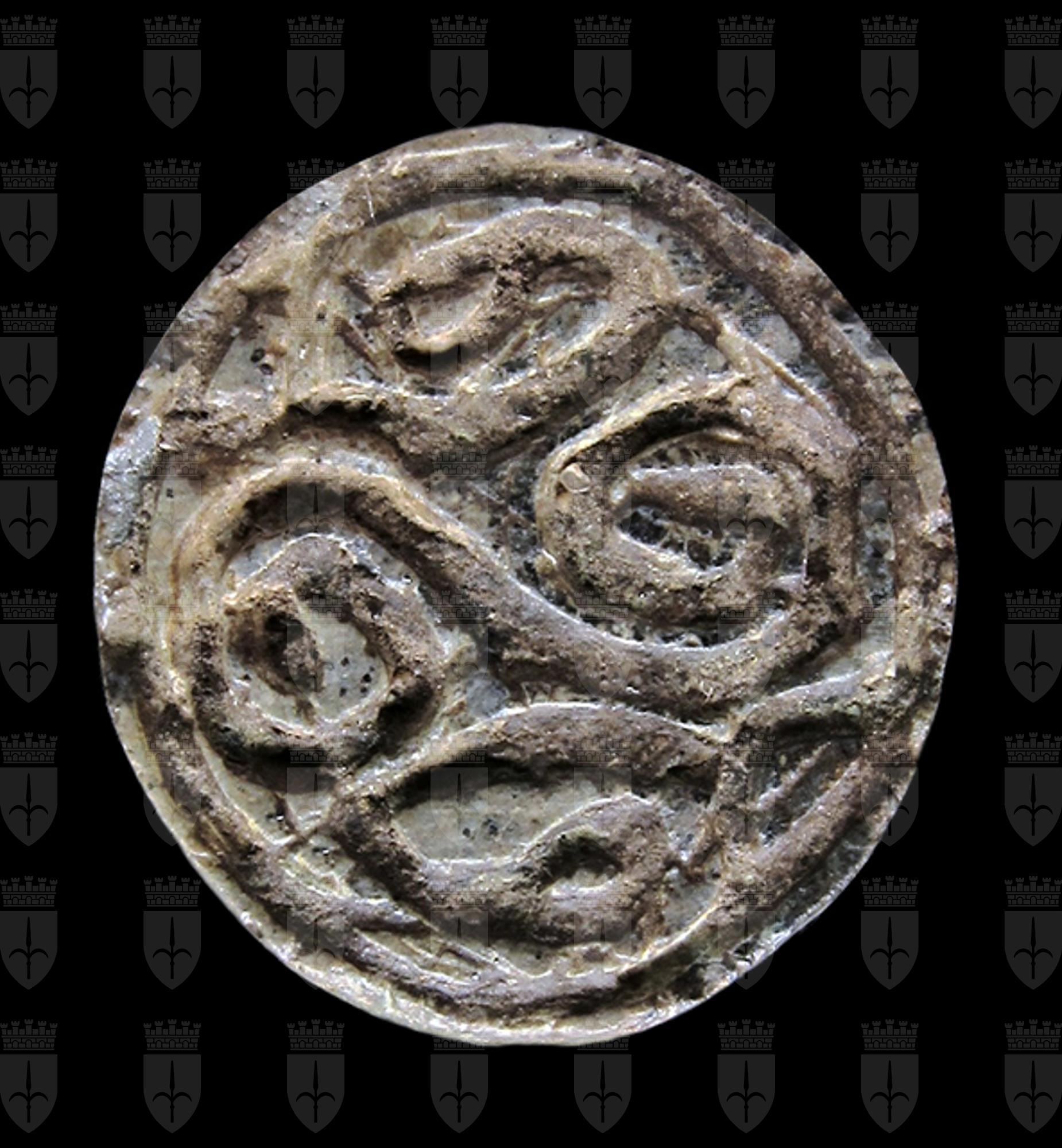 Scaraboide in steatite grigiastra con sul ventre incisione di motivo decorativo a spirale. Dorso che ricorda la forma di una conchiglia. Foro passante longitudinale.