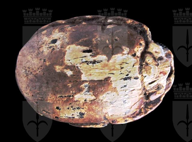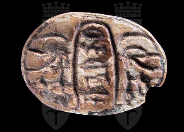 Scarabeo in steatite marrone con sul ventre incisione di un motivo molto simile a quello “a-n-r” in un cartiglio disposto verticalmente, affiancato su ciascun lato da un ugiat e due segni nefer. Dorso con clipeo, elitre e protorace non sono distinti. Foro passante longitudinale.