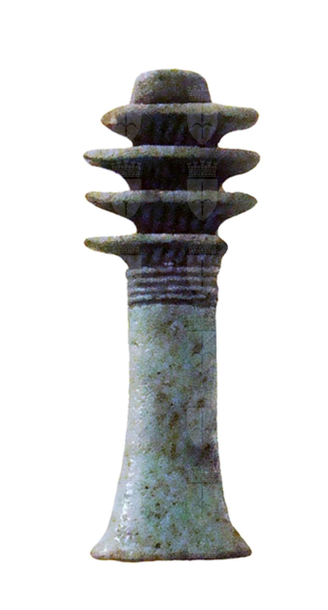 Amuleto in faience, con pilastro dorsale forato, che raffigura il geroglifico "djed", a forma di pilastro con quattro espansioni nella parte superiore, che indica stabilità, immutabilità, eternità, resurrezione, ma anche forza inestinguibile ed incorruttibilità. Già nella Prima Dinastia (3150 – 2925 a.C.) era un pilastro intorno al quale venivano legate spighe di grano; dal Nuovo Regno (1543 – 1078 a.C.) fu interpretato anche come spina dorsale di Osiride. Un djed, meglio se in oro, era posto sulla gola del defunto durante il suo funerale, con il compito di farlo divenire uno spirito santificato e perfetto, un seguace di Osiride. Nel capitolo 155 del Libro dei Morti l’amuleto fa sì che “è tua nuovamente la tua spina dorsale e le tue vertebre, così che puoi tornare a muoverti...”.