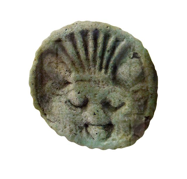 Piastrina circolare in faience, con bordo seghettato e foro passante, con funzione di amuleto. Raffigura su una faccia il volto della divinità apotropaica Bes, frontale con le orecchie sporgenti, le sopracciglia evidenziate, la barba e il grande naso piatto. Sul capo porta una corona di piume di struzzo. Sulla faccia opposta vi è l'immagine di un occhio udjat.
