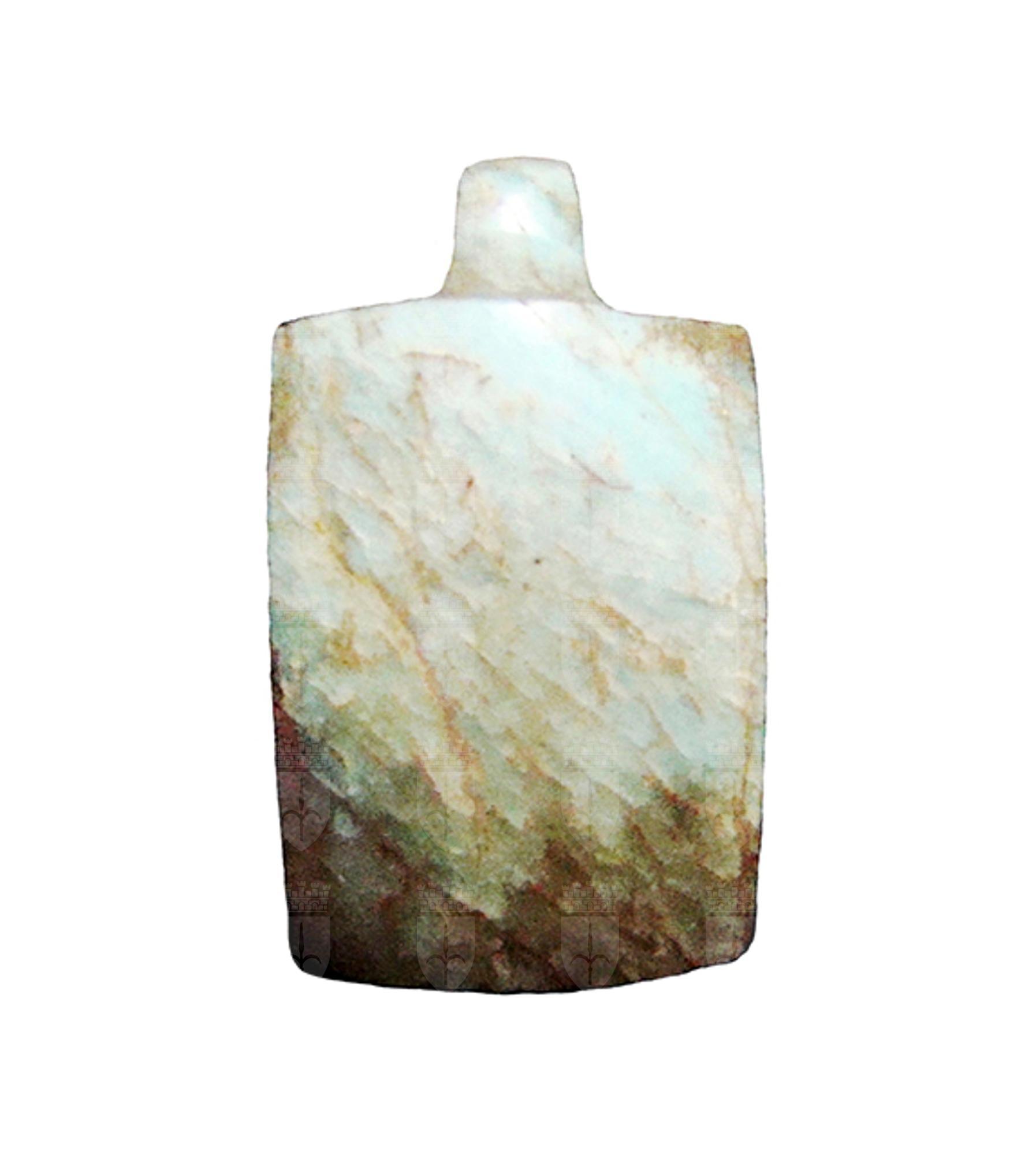 Amuleto in turchese lavorato a tutto tondo, raffigurante una tavoletta per scrivere liscia e rettangolare, con presa superiore forata. Amuleti di questo tipo si diffusero a partire dalla XXVI dinastia (dal VII secolo a.C.).