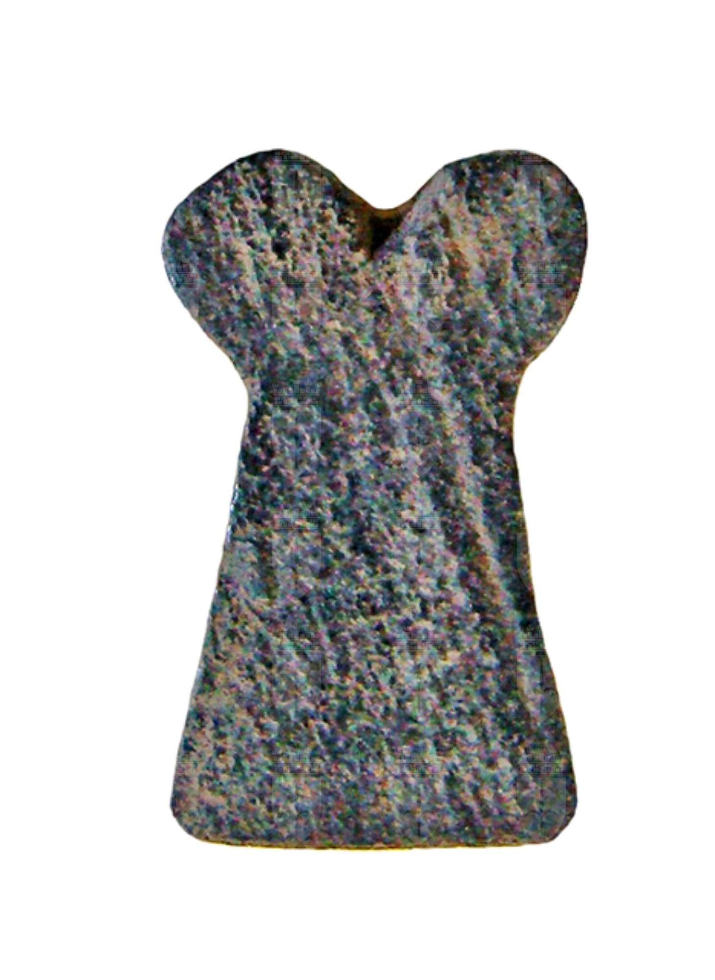 Amuleto in pietra, bidimensionale, che raffigura la silhouette di una coppia di piume di struzzo disposte simmetricamente e riconoscibili per la sommità tondeggiante e rigonfia, mentre la base è insolitamente diritta. L'amuleto è privo di foro per la sospensione. La piuma di struzzo singola era l'emblema della dea Maat, garante della verità e della giustizia.