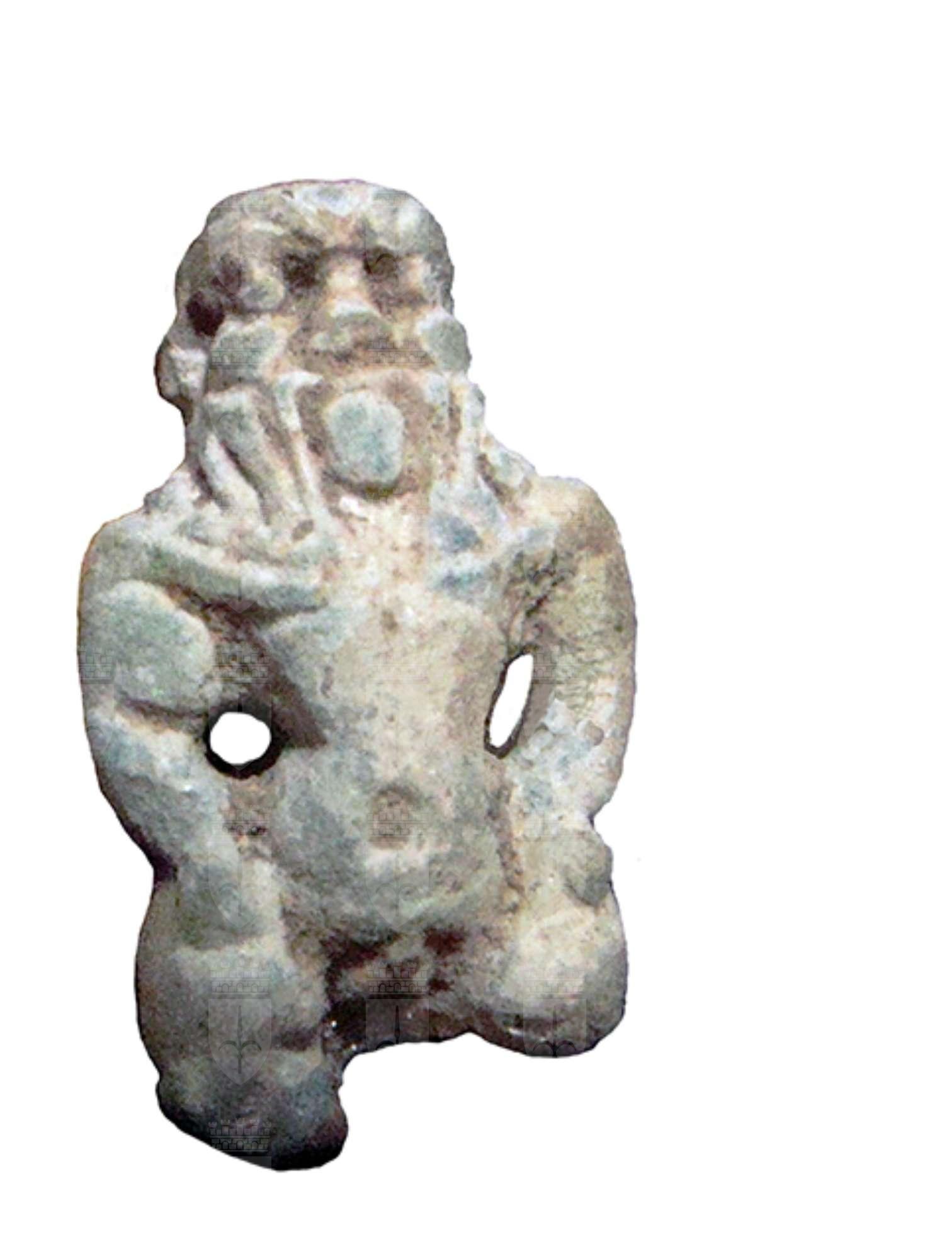 Amuleto in faience raffigurante la divinità apotropaica Bes. Il dio è raffigurato nel suo aspetto consueto: con il corpo tozzo e le gambe arcuate, le braccia appoggiate sulle cosce, il volto frontale con le orecchie sporgenti, le sopracciglia evidenziate, la barba e il grande naso piatto. Sul capo porta una corona di piume di struzzo, mentre i piedi poggiano su una piccola base quadrangolare. In questo esemplare danneggiato, tuttavia, mancano sia la corona che parte delle gambe.