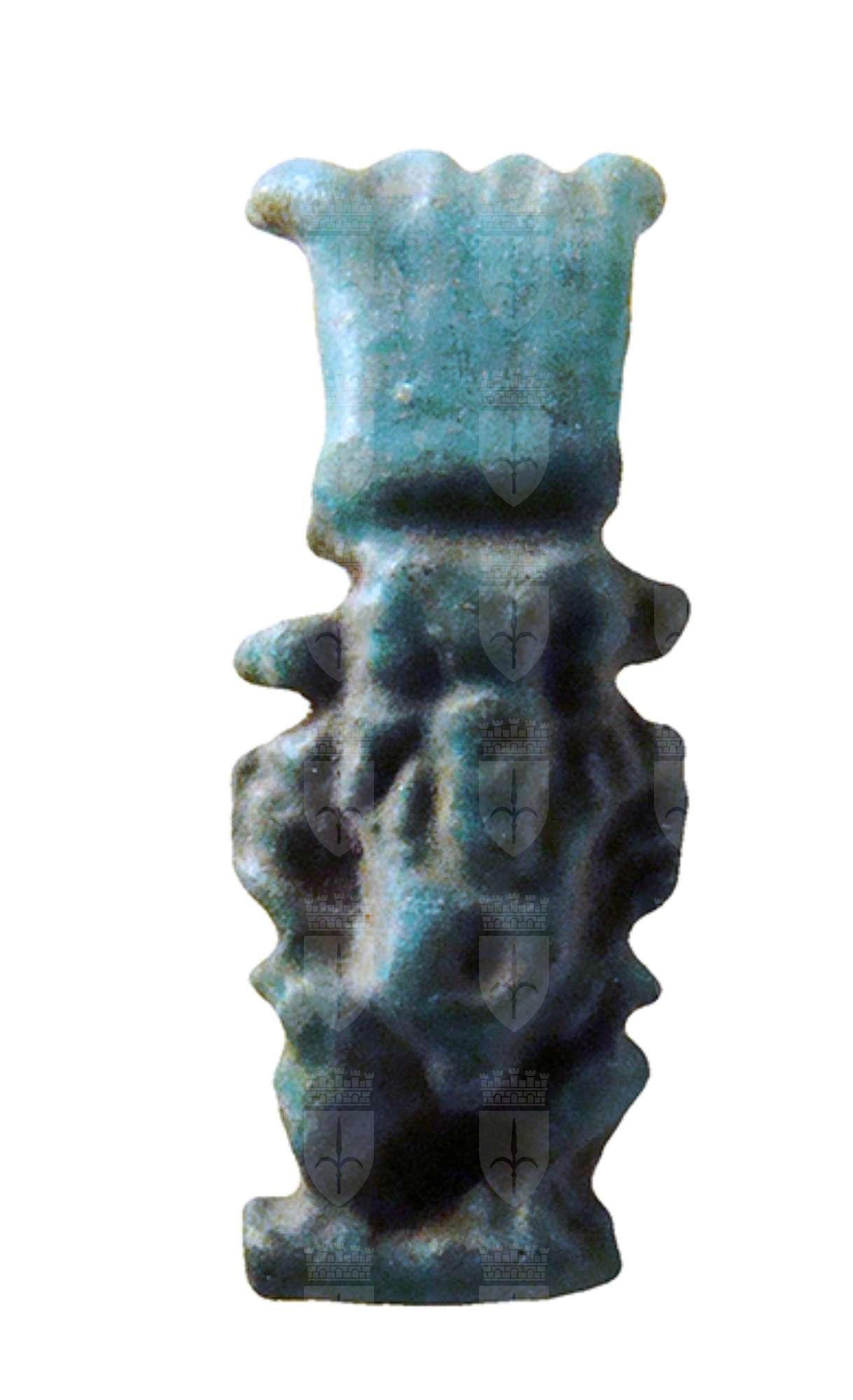 Amuleto in faience raffigurante la divinità apotropaica Bes. Il dio è raffigurato nel suo aspetto consueto: con il corpo tozzo e le gambe arcuate, le braccia appoggiate sulle cosce, il volto frontale con le orecchie sporgenti, le sopracciglia evidenziate, la barba e il grande naso piatto. Sul capo porta una corona di piume di struzzo, mentre i piedi poggiano su una piccola base quadrangolare. Presenta un foro passante all'altezza della corona.