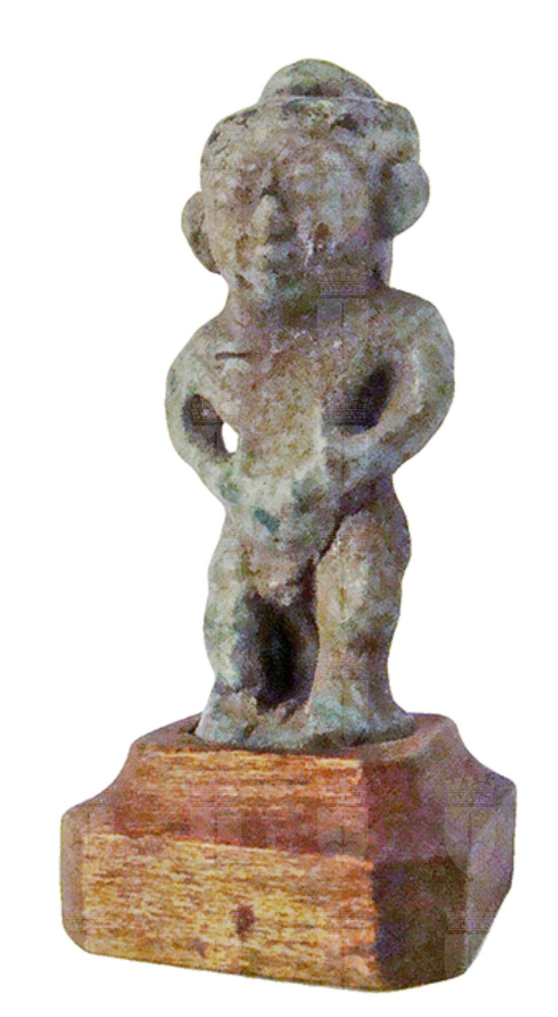Amuleto in faience, raffigurante il dio minore Pateco, associato al dio Ptah e protettore degli artigiani. Il dio ha il corpo di un nano: nudo, ha la testa grande, normalmente rasata o con la calotta tipica di Ptah, il corpo tozzo e le gambe arcuate, con le braccia appoggiate sulle cosce e i piedi uniti. Sul retro dell'amuleto vi è il pilastro dorsale, forato per permetterne la sospensione e decorato da dei geroglifici, purtroppo illeggibili.
