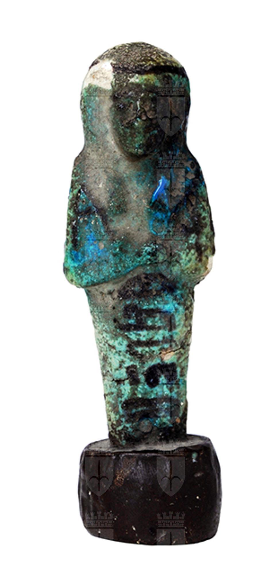 Parte superiore di statuina funeraria mummiforme che indossa la parrucca tripartita con il seshed. Le braccia sono incrociate sul petto, la destra sulla sinistra, e le mani reggono entrambe una zappa. Dietro la spalla sinistra pende quella che sembra essere una zappa. Sotto le braccia parte la colonna di iscrizione, che non è completamente visibile dal momento che l'ushabti è irremovibilmente infisso in una base cilindrica non originale. Tutti i dettagli sono resi con dipintura in nero.
