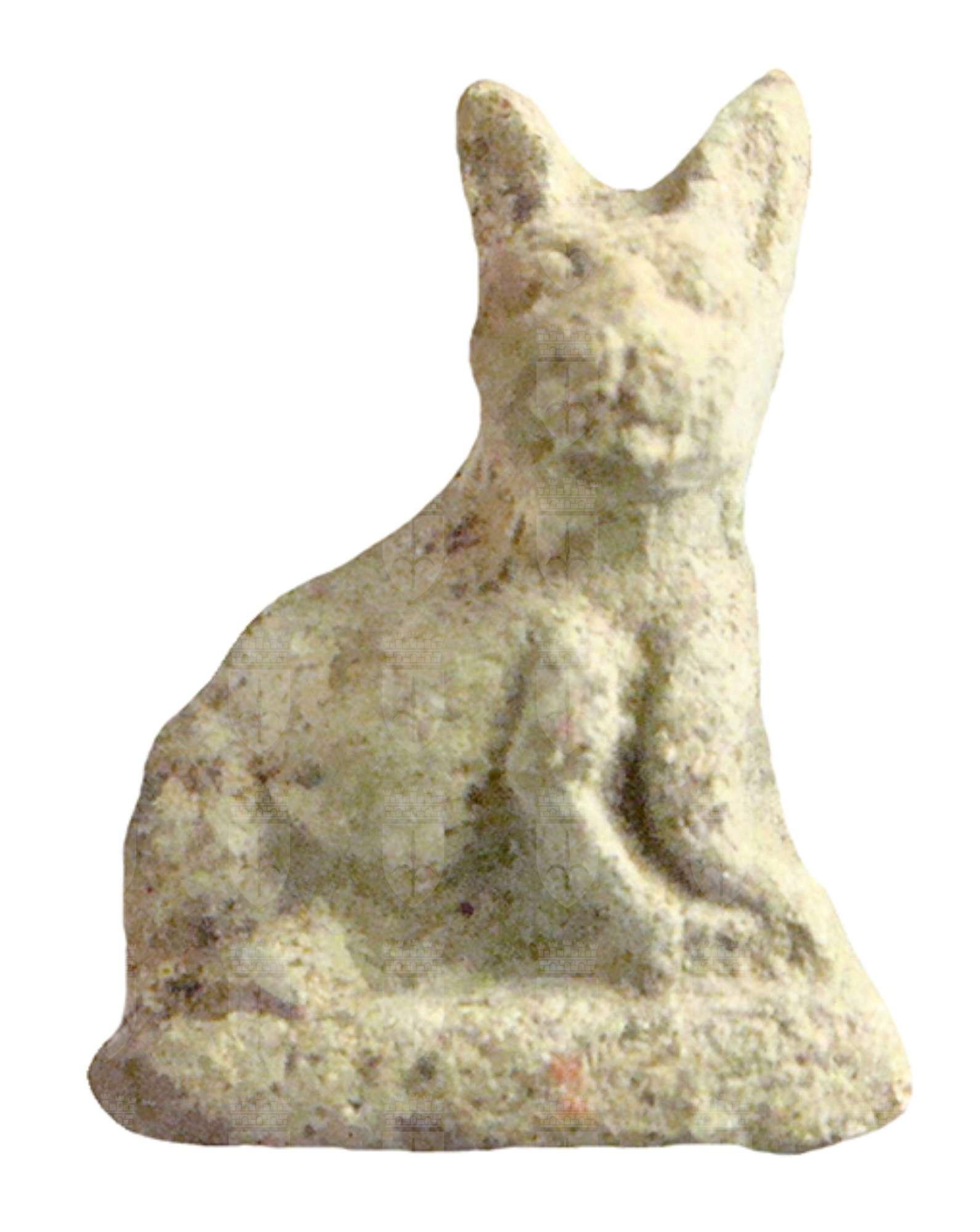 Amuleto in faience lavorato a tutto tondo, raffigurante un gatto dalle grandi orecchie seduto su una piccola base; la testa del gatto è girata verso destra; all'altezza del collo vi è un foro passante.
