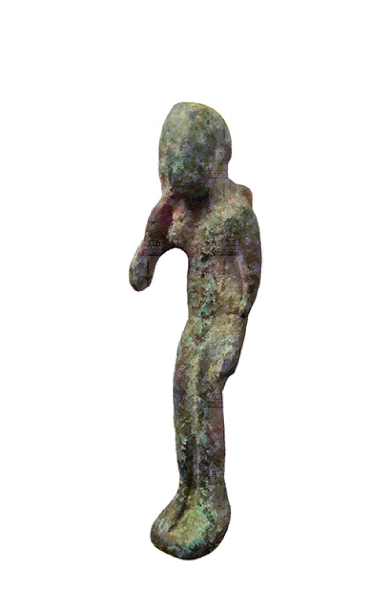 Amuleto in bronzo raffigurante il dio Arpocrate: il dio fanciullo è ritratto nudo, semidisteso. Dietro le spalle vi è un anello di sospensione. I tratti iconografici che lo contraddistinguono sono la treccia infantile che scende sul lato destro del capo e il braccio destro piegato per portare l’indice alla bocca. Arpocrate è una divinità bambina il cui culto avrà molta fortuna nelle epoche finali della storia egiziana, ed è considerato figlio di Iside ed Osiride.