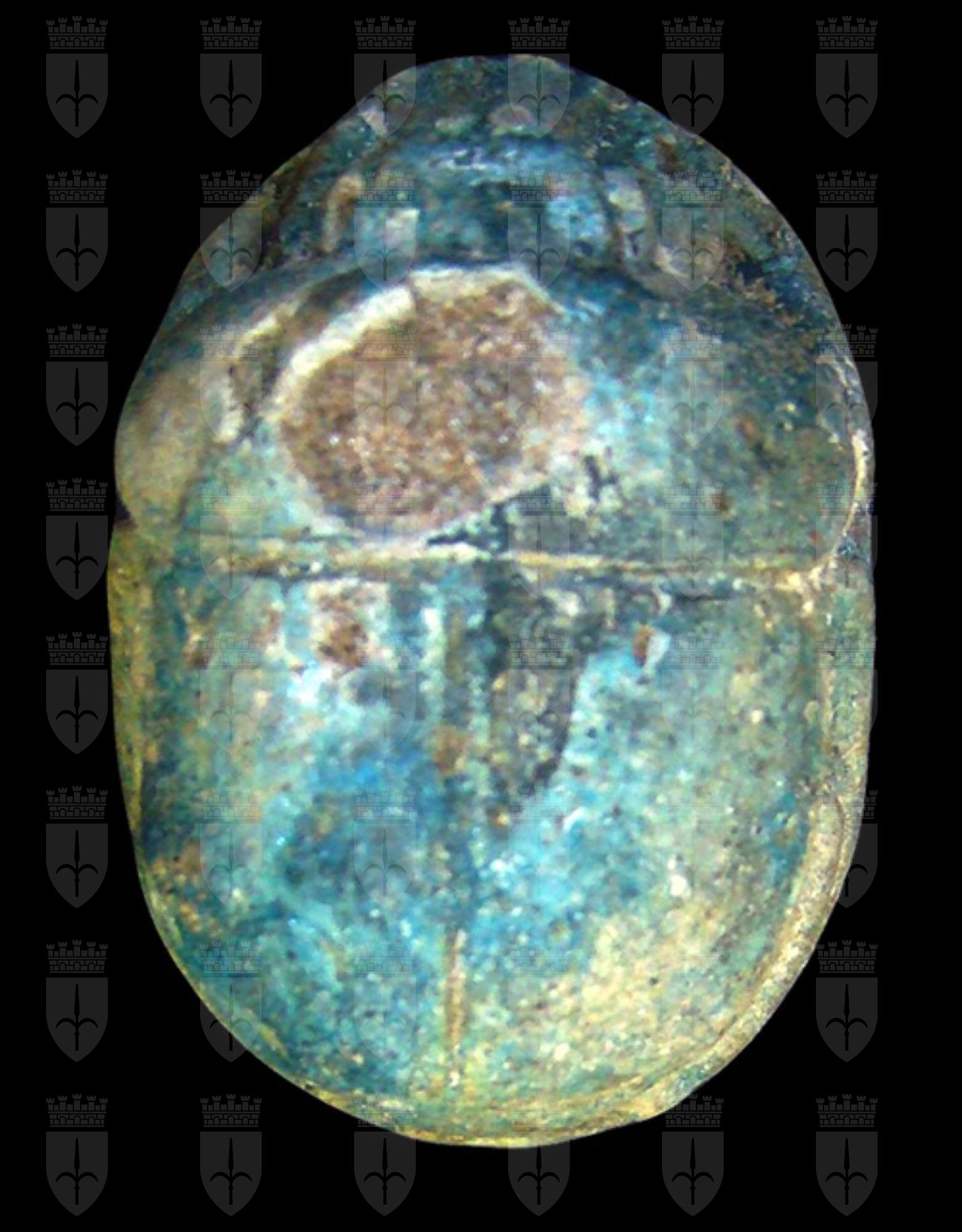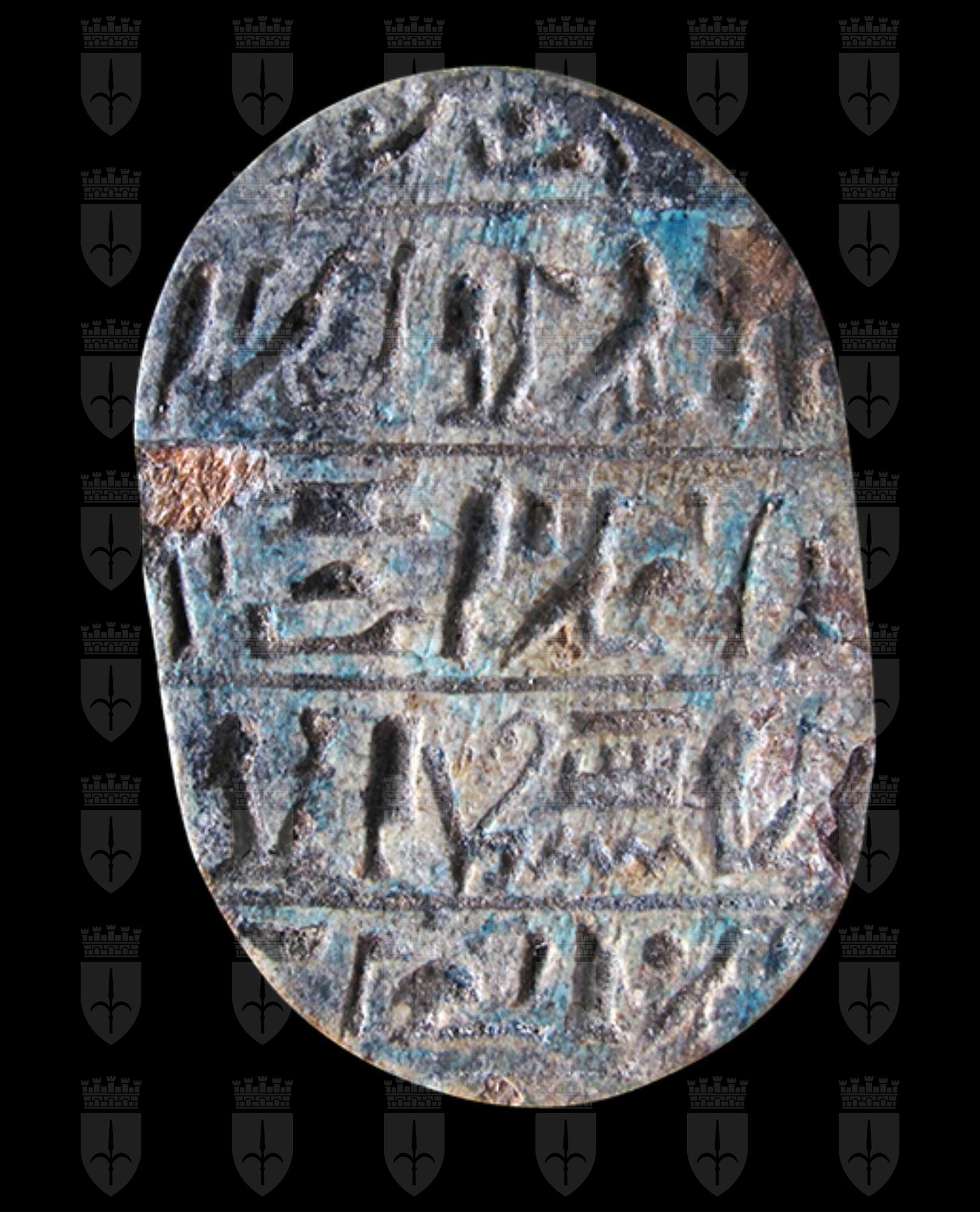Scarabeo in steatite invetriata marrone sul cui ventre si vedono cinque incomprensibili righe di iscrizione. Incisione del clipeo sulla testa e della divisione a T tra protorace ed elitre. Foro passante longitudinale.È possibile che la pseudo iscrizione sia stata aggiunta ad uno scarabeo autentico per aumentarne il valore.