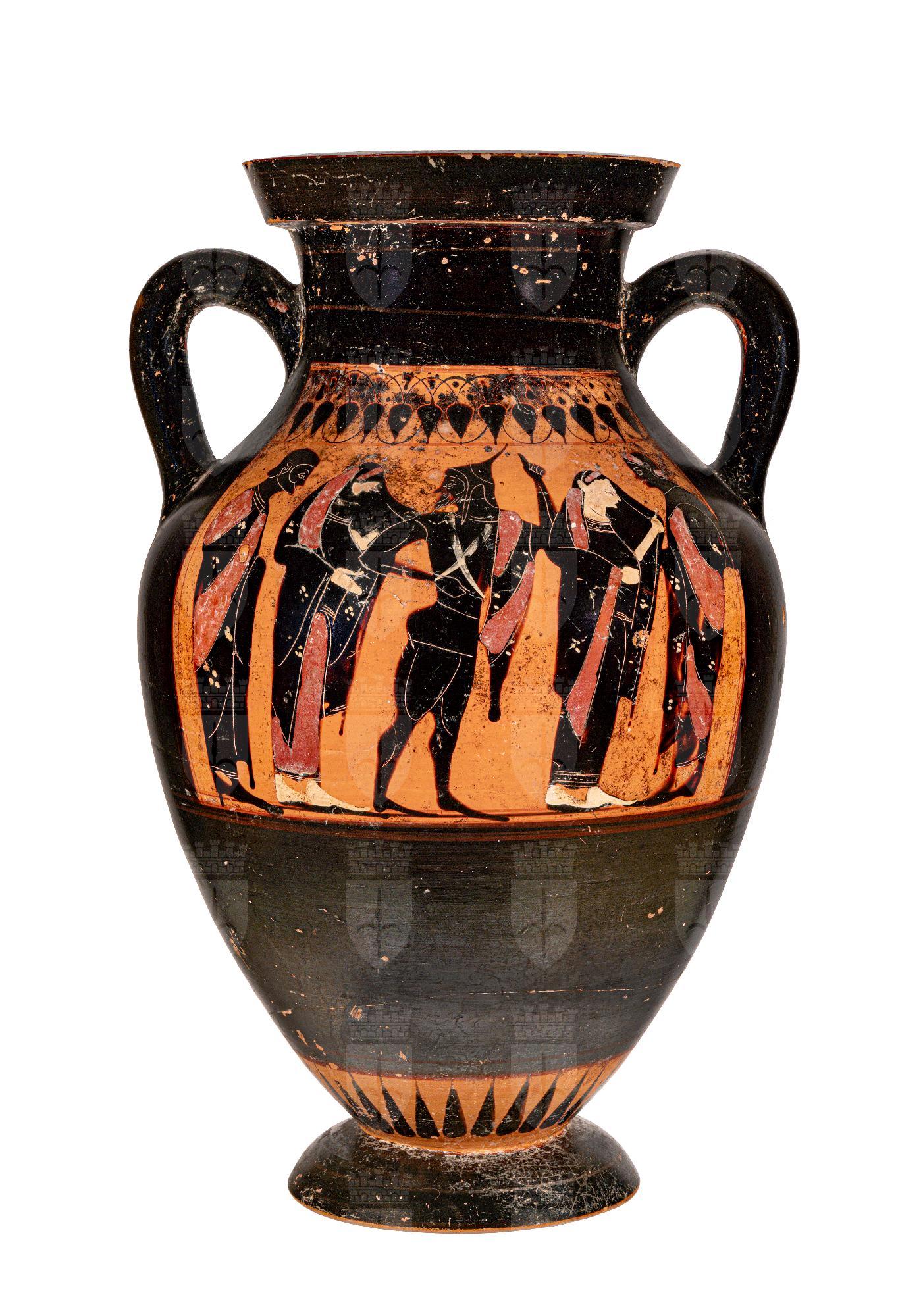 Anfora a figure nere con colori aggiunti e graffito. Lato A: La scena si compone di un uomo barbato stante e due coppie di personaggi in partenza: le due donne sono stanti, dal capo coperto dal mantello mentre uno degli uomini ha berretto a punta di foggia scitica, l’altro dall’aspetto robusto ha tenia nei capelli. Lato B: Un Anziano incoraggia gli atleti impegnati nella gara della corsa armata: sono nudi e indossano gli schinieri e l’elmo corinzio con alto lophos, portano lo scudo rotondo; chiude la scena un altro spettatore più giovane. Sotto la base sono dipinte in rosso due lettere in legamento: CE
