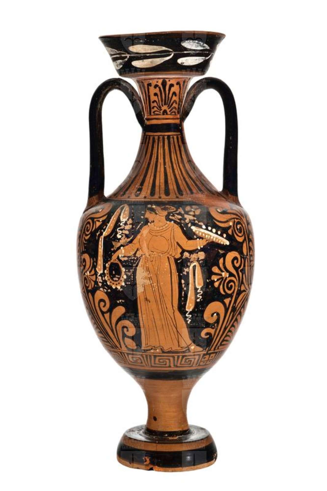 Anfora panatenaica a figure rosse con elementi sovradipinti in bianco e giallo. Alto labbro svasato; collo stretto; breve spalla arrotondata; corpo ovale; alto stelo su ampio piede troncoconico; anse a nastro impostate fra il centro del collo e la spalla. Sul labbro ramo d'alloro; palmette sovrapposte fra girali con foglie; inferiormente meandro interrotto da rettangoli con croce e puntini. Lato A: defunta in chitone seduta su roccia all'interno di un'edicola con specchio in mano. Lato B: scena di offerta: donna stante con phiale e serto a corona.