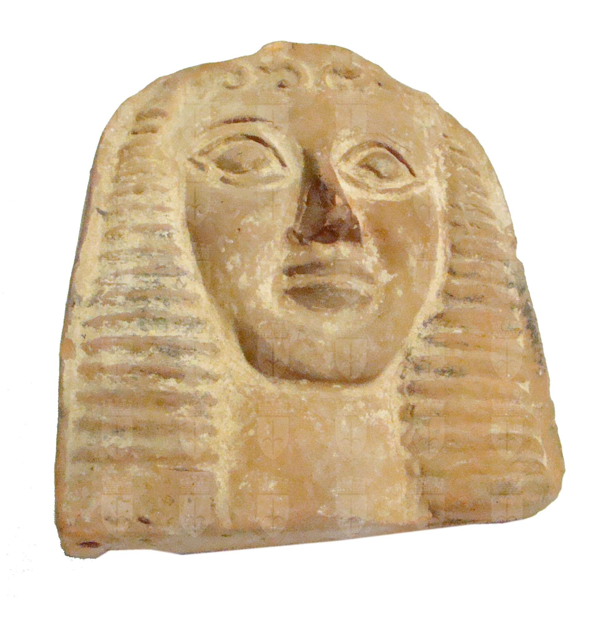 Antefissa con volto dedalico (capigliatura e occhi di tipo egiziano, visione frontale).
