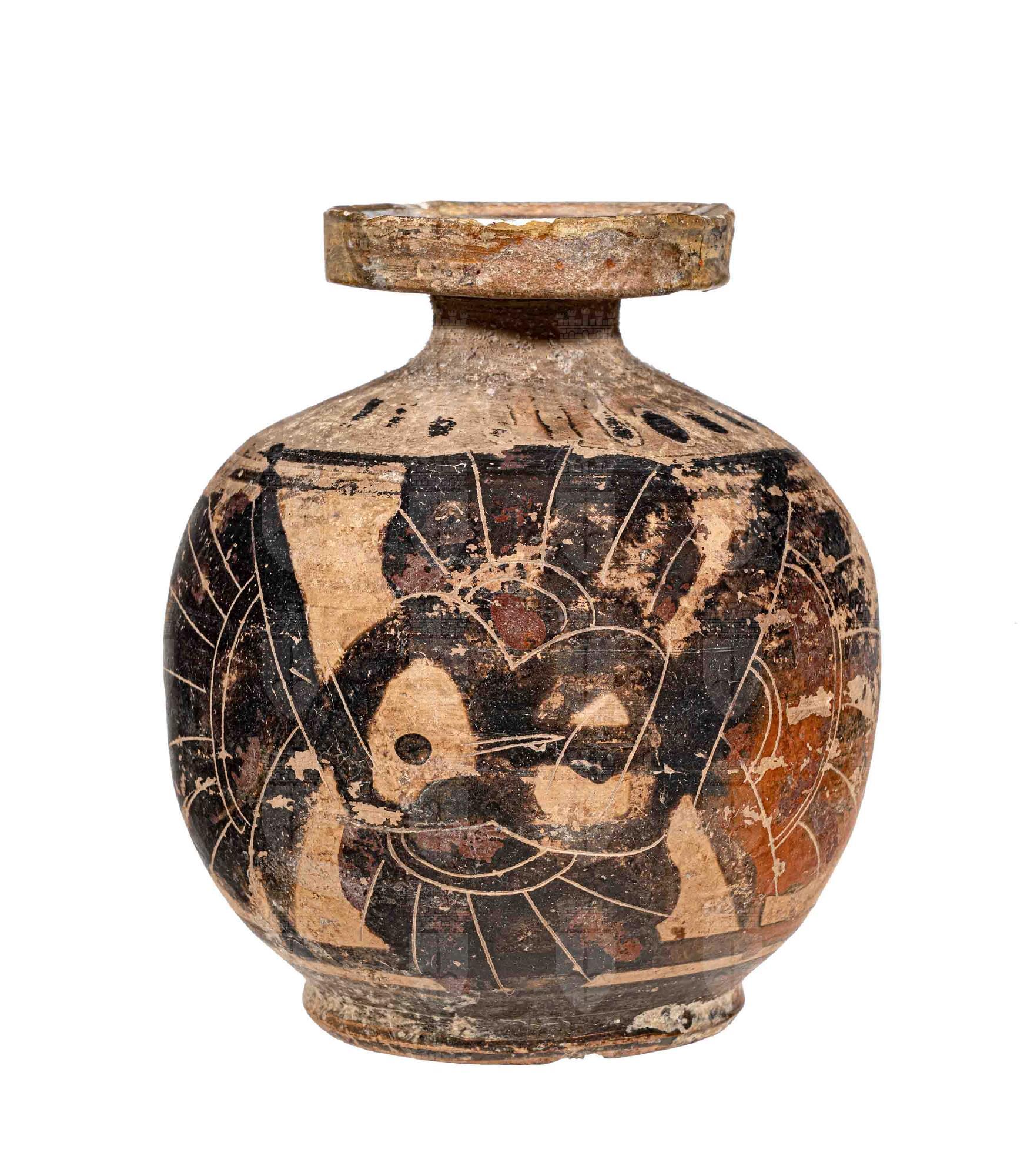 Grande aryballos corinzio con uccello visto frontalmente con le ali spiegate (civetta?) e altro uccello (gallo) in atto di camminare.