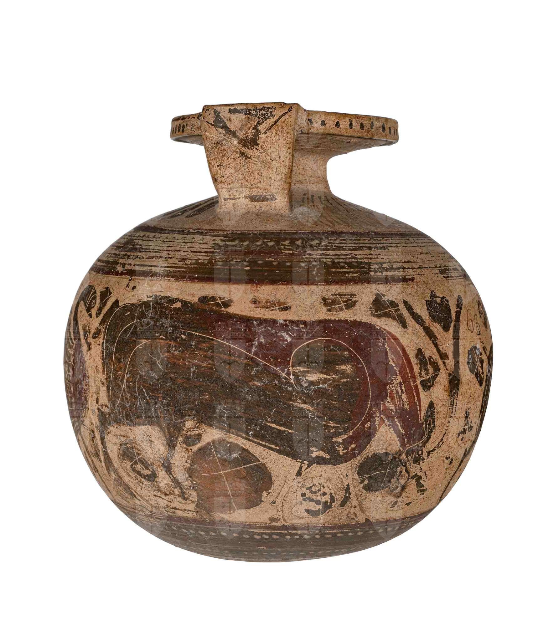 Aryballos etrusco-corinzio con ansa piatta e immagine di due sfingi a testa maschile con barba, affrontate con in mezzo un cigno; stambecco pascente e rosette. Superiormente e inferiormente decorazione a fasce di colore diverso alternate e puntini gialli. Base, spalle e labbro espanso con baccellatura.