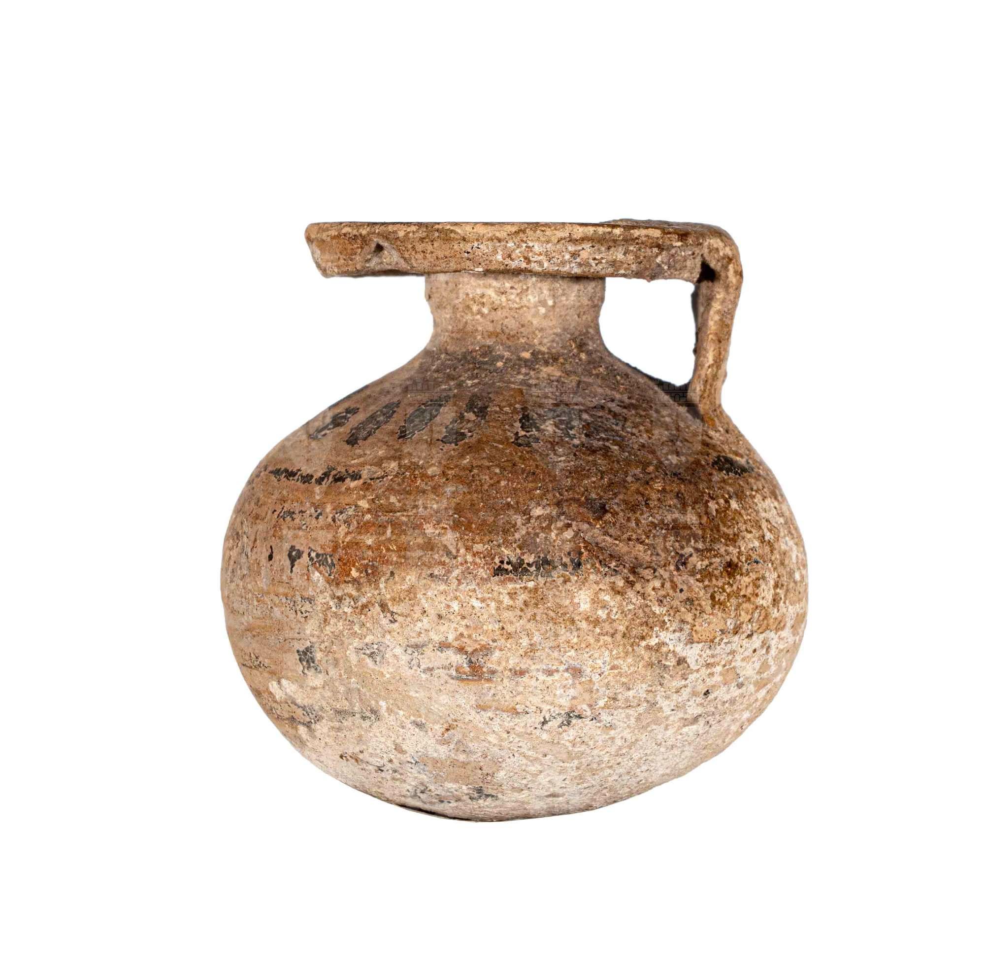 Aryballos corinzio a fasce brune, tratti verticali sulla spalla.