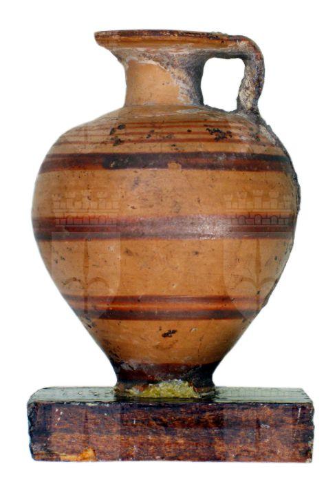 Balsamario. Orlo a tesa, collo cilindrico, corpo ovoidale, spalla carenata a profilo convesso, ansa impostata tra il bocchello e la spalla, piede a disco. Decorazione in rosso, con fasce parallele di diverso spessore alternate a fasce risparmiate sull’orlo, sulla spalla, sul ventre e sul piede. Visibili i segni del tornio.