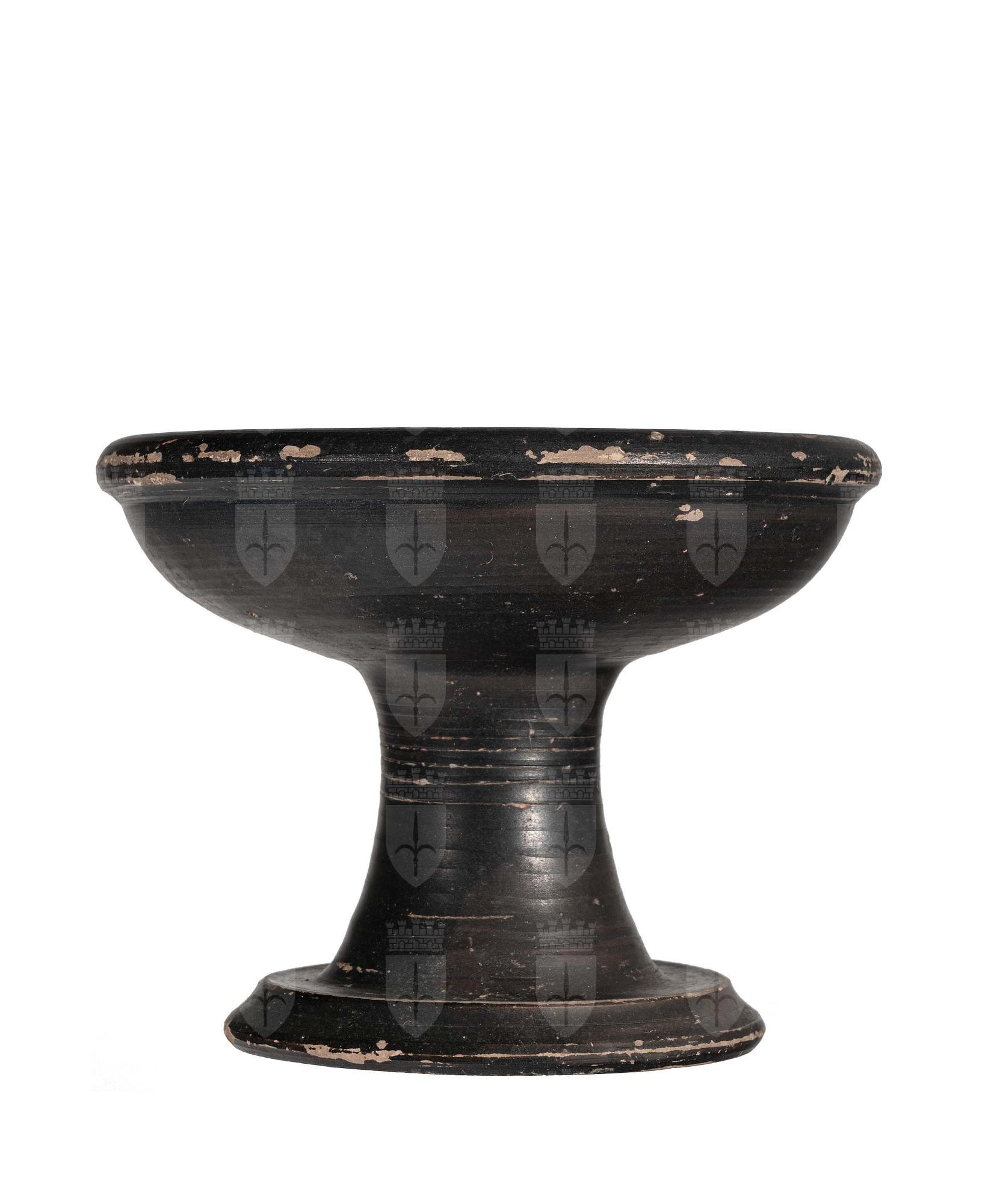 Calice a coppa ellittica su alto stelo a vernice nera; incisione interna a cerchietti concentrici.