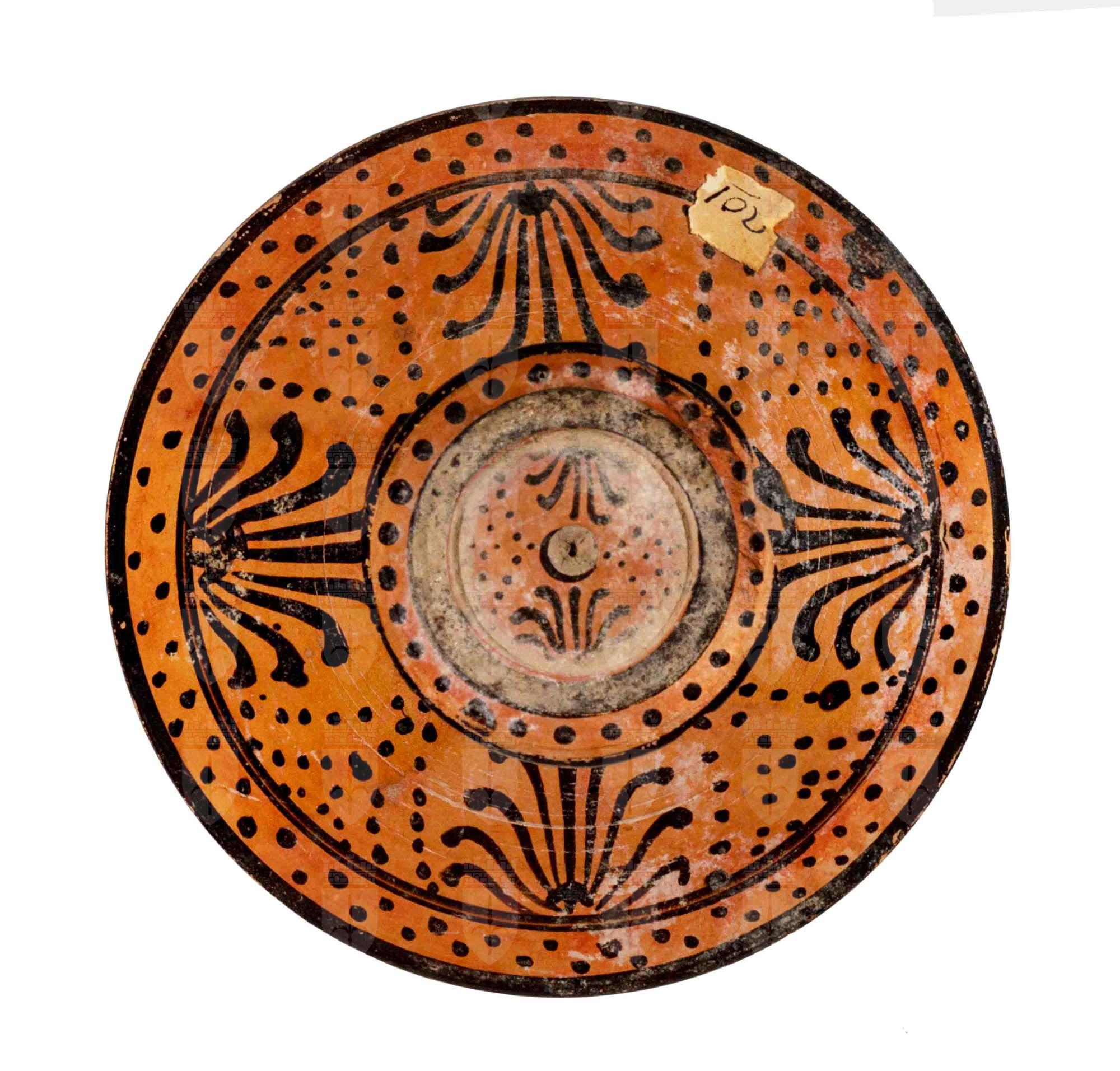 Presa troncoconica con orlo leggermente estroflesso; fascia perimetrale insellata con tondo centrale leggermente rialzato con tondello mediano incavato; stelo modanato all’attacco con la presa con lievissima modanatura mediana; spalla obliqua; orlo verticale. Sulla presa, circonferenza esterna con fila di punti in nero; sul tondello centrale, coppia di palmette speculari e opposte in nero, alternate a triangoli puntinati; sulla tesa, entro circonferenza in nero, due coppie di palmette speculari e opposte, con foglie ricurve all’estremità, alternate ad aree triangolari puntinate in nero; circonferenza esterna decorata con due file di punti alternati in nero. Parete verticale dell’orlo con motivo ad onde correnti verso s. a risparmio. Appoggio, interno della calotta lasciati a risparmio.