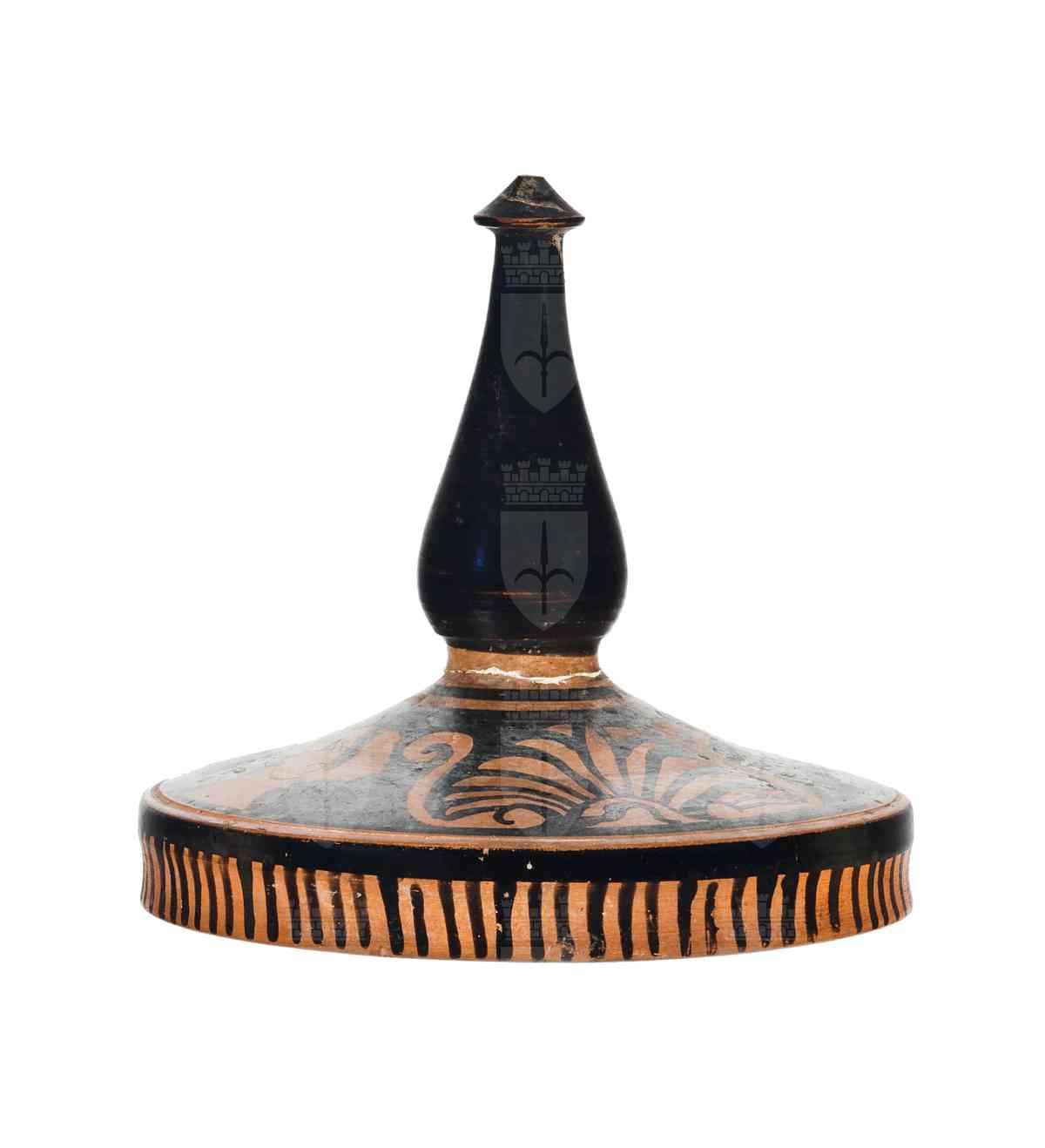 Argilla giallo rossastra (5 YR 6/6 Munsell); vernice lucente, di buona qualità, ben conservata e con scalfitture pressoché inesistenti. Il coperchio è appena coperto, in alcune piccole zone, da una leggera patina e presenta un'unica presa centrale sormontata da una piccola protuberanza di forma conica. L'apparato decorativo è costituito da due busti maschili uguali, di profilo verso sinistra. I busti sono caratterizzati da un naso molto pronunciato, soprattutto per la sporgenza all'altezza della fronte; dai capelli ridotti ad una sola striscia di ciocche attorcigliate su sé stesse, che lasciano scoperta la parte superiore del cranio come in una chierica da frate; infine, da un collo molto tozzo, quasi un tutt'uno con il busto sottostante. Si alternano a questi busti due palmette tra girali. Gli spazi tra le palmette e i busti stessi sono arricchiti entrambi con un fiorellino stilizzato con corolla centrale a quattro o cinque petali, reso mediante sovraddipintura, la quale, tuttavia, risalta poco rispetto alla vernice nera di fondo, appena più scura. Il resto della decorazione accessoria è costituito invece da una sottile fascia risparmiata tra il coperchio e l'attacco del manico, da due ulteriori filetti risparmiati che sottolineano superiormente e inferiormente la decorazione principale, e da una baccellatura che arricchisce il bordo esterno del coperchio. Il coperchio è tradizionalmente associato al lebete del Pittore del Primato con inventario 1811. Nonostante la forma sembri genuina, a causa delle tracce di lavorazione che indicano l'uso di un tornio elettrico, nonché della qualità e del tipo di decorazione (in cui le sovraddipinture coprono la patina fluorescente, che invece dovrebbe essere il risultato delle condizioni di giacitura e quindi posteriore), Bellinato ritiene che questo coperchio sia il prodotto di un artigiano che operò probabilmente nel XIX secolo dell'era moderna.