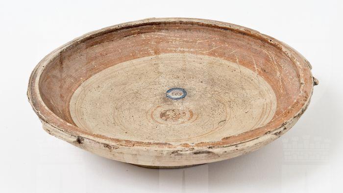 Coppa con vasca fonda, a profilo convesso. Piede ad anello, labbro orizzontale a listello interrotto, con sette prese orizzontali ad aletta. Decorazione interna in rosso diluito, su fondo chiaro; larga fascia lungo l’orlo e serie di linee parallele concentriche, con cerchio pieno al centro.