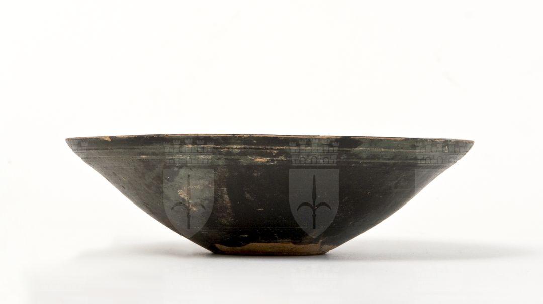Coppa emisferica con pesci a vernice nera, a tratti più chiara e tendente al rosso, con sovraddipinture in bianco crema, giallo ocra e rosso amaranto ed incisioni. Orlo dritto, con doppia scanalatura al di sotto, vasca poco profonda, apoda. Interno della vasca: stella o fiore dai petali aperti ed espansi sovraddipinta su un bottone centrale. Sulle pareti tre delfini alternati a tre palmette con fiori di loto. I solchi incisi vanno a distinguere l’orlo dal corpo ed il fondo delle pareti della vasca, rimarcati da fasce in rosso amaranto.