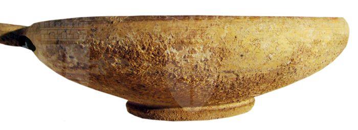 Coppa monoansata. Orlo arrotondato, labbro fortemente introflesso, vasca a profilo convesso, piede a disco, ansa a nastro spessa e obliqua, impostata sotto l’orlo, sormontante. Decorazione monocroma in bruno con fasce orizzontali all’esterno della vasca decorata da linee nere e rosse sul corpo assai sbiadite e coperte da incrostazioni.