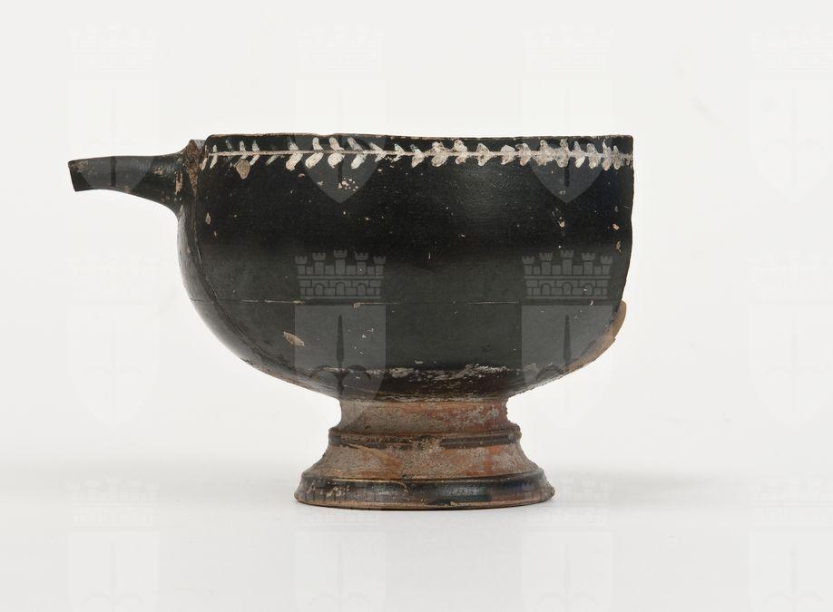 Coppa su piede a vernice nera lucente con sovraddipinture in bianco, giallo, rosso ed incisioni. Ricomposta parte della vasca. Orlo leggermente estroflesso, vasca emisferica, anse a bastoncello impostate orizzontalmente sotto l’orlo e ad andamento quadrangolare, alta gola di raccordo, piede troncoconico modanato. A: Sotto l’orlo, tra una linea e due coppie di linee incise, sequenza di ovuli incisi e dipinti con punti e tremuli giallo-rossi; sul corpo, presumibilmente tra quattro rami d’alloro, con stelo lineare inciso, due esterni diritti, due interni ricurvi verso l’interno, si intravedono due rosette, una di punti ed un’altra con cerchio centrale e petali a semicerchio. [259]