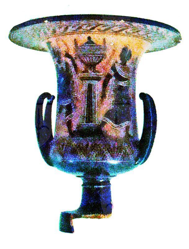 Cratere a calice falso a figure nere. Lato A: scena di sacrificio: davanti ad un altare un guerriero e una sacerdotessa. Lato B: scena di offerta davanti a uno stamnos posto su un pilastro con un guerriero e una sacerdotessa.