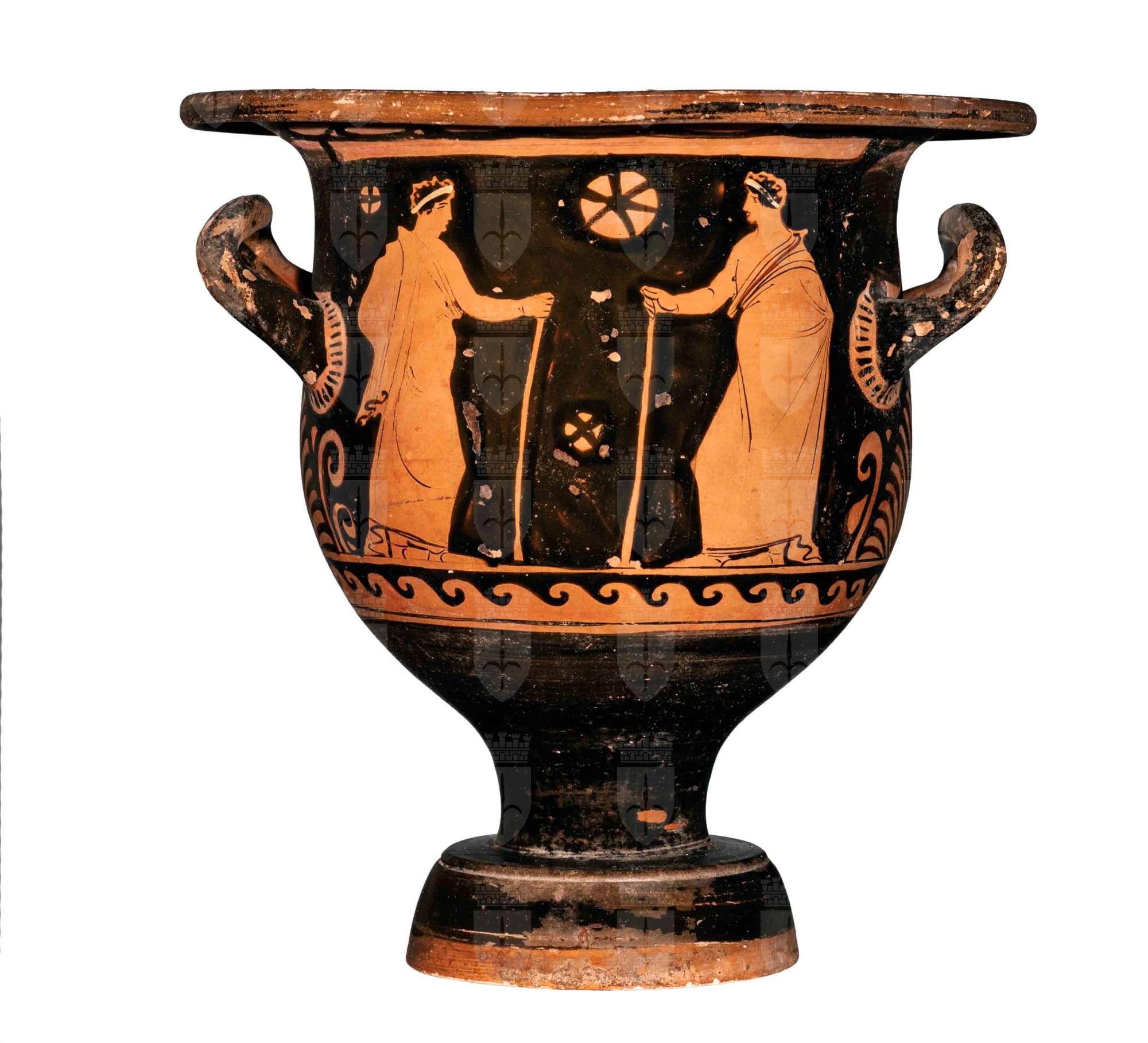 Cratere a campana apulo a figure rosse; fascia con serto di alloro sotto il labbro e ad onda marina sotto le scene figurate. Lato A: giovane nudo con tirso e grappolo; fanciulla con grappolo e patera; albero. Lato B: due giovani ammantati con bastone.