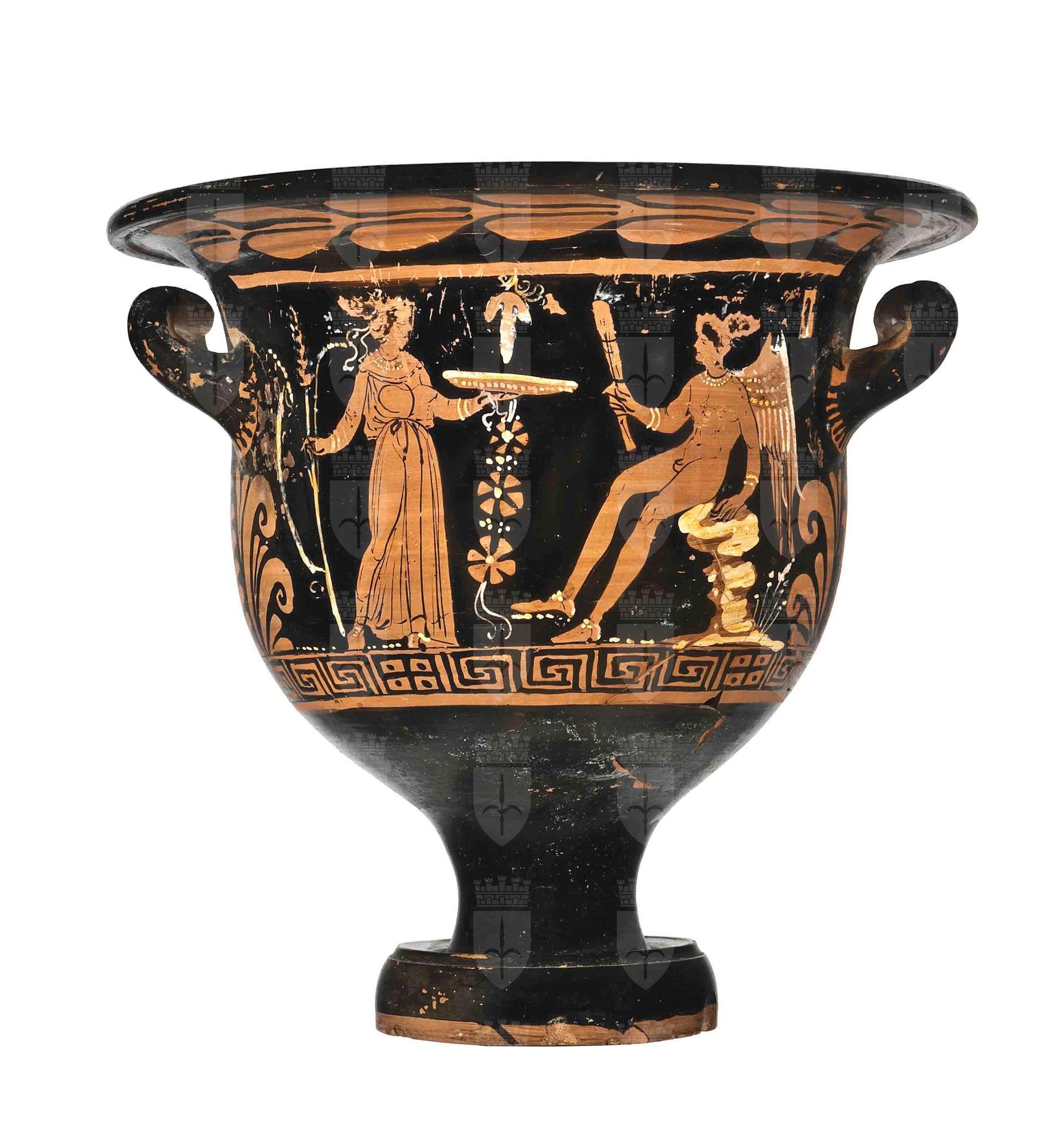 Cratere a campana. Orlo estroflesso, distinto dalla vasca da una lieve mondatura evidente al tatto; labbro arrotondato, a sua volta distinto dall'orlo da una sottile mondatura a cavetto. Anse a sezione circolare impostate orizzontalmente e rialzate; piede ad echino cavo, incavato all'attacco con lo stelo e modanato alla sommità Lato A: Eros seduto con fiaccola e menade stante. Eros seduto di tre quarti verso sinistra su roccia sovradipinta in bianco e giallo con infiorescenze sulla base; regge nella mano destra sollevata una fiaccola accesa ( con fiamma evanida), mentre la mano sinistra poggia sulla seduta.Il dio è nudo e indossa calzari chiusi con dettagli sovradipinti sul collo del piede e sui calcagni. Nelle ali il piumaggio è decorato con punti e tratti sovradipinti. Sulla sinistra, menade stante vestita con un chitone stretto in vita. I piedi sono calzati con delle basse embades, la chioma raccolta in una mitra, con nastri bianchi sovradipinti. Le braccia sono allargate e sul palmo della mano sorregge una phialè decorata presso l'orlo e sulla breve vasca rispettivamente da una linea metopale risparmiata di spessore irregolare, grappolo d'uva con tralcio e foglia nastri. Sempre nella mano sinistra regge una ghirlanda, costituita da una fila di tre rosette sovrapposte a sei petali con bottone centrale, da cui si dipartono tre rami; due, resi con file di puntini, sovradipinti in bianco e giallo con infiorescenze. Nel campo, in alto a destra finestra strombata profilata in bianco. Lato B: Due giovani ammantati a colloquio. Ambedue appoggiati al bastone, sono stanti, di profilo e affrontati. Entrambi hanno la testa cinta da una benda sovradipinta in bianco e indossano un himation bordato e drappeggiato trasversalmente che lascia spalle e braccia destro scoperte e forma un fascio di pieghe parallele intorno al busto.