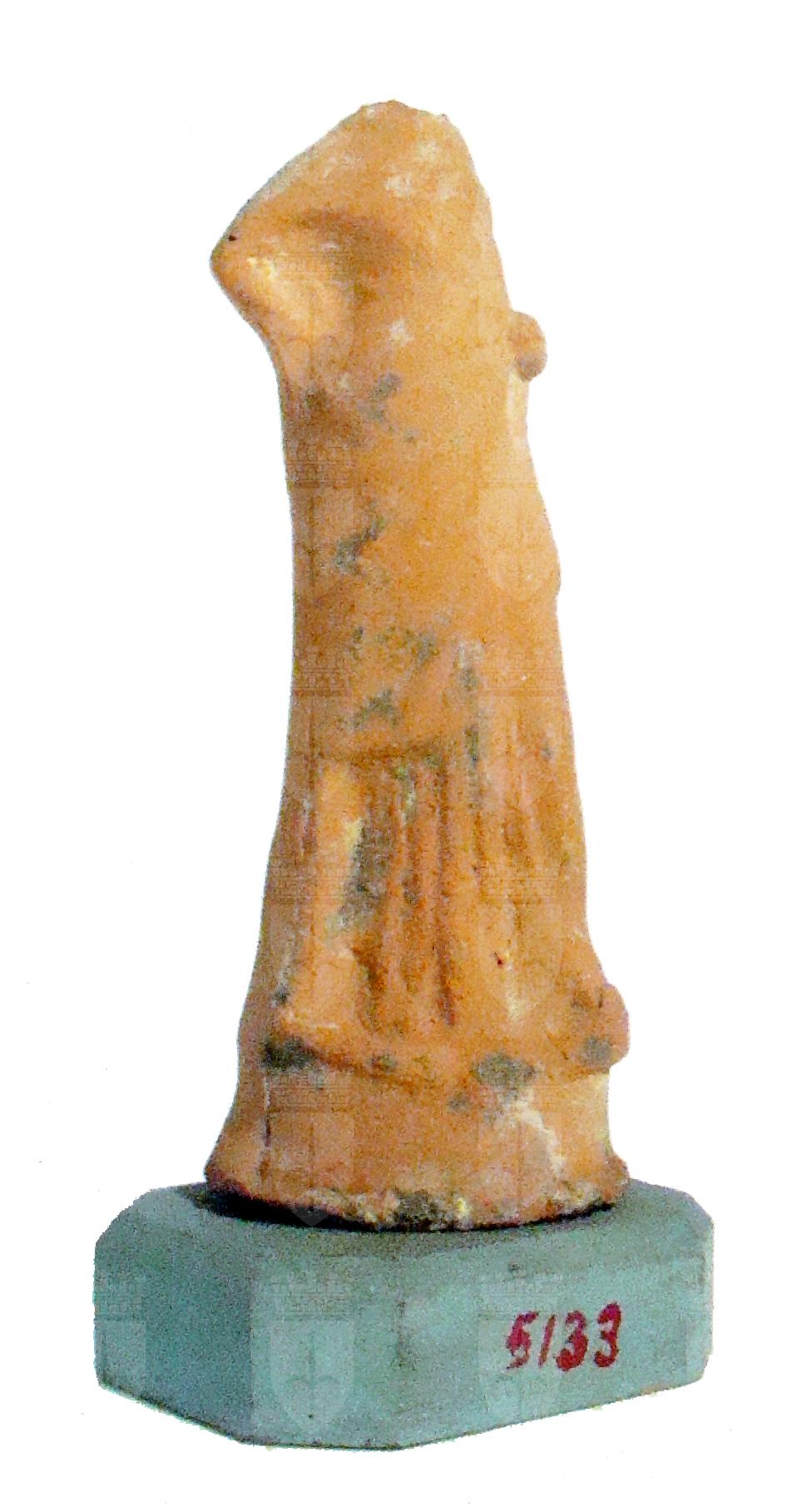 Figurina in terracotta, realizzata a matrice, alloggiata su una base moderna. Retro non lavorato. Scritta in rosso "654 5133". Sul fondo della basetta lignea è presente la scritta in matita "6 marzo 1885". Figurina femminile stante, con la gamba sinistra avanzata. Braccio sinistro sul ventre coperto in parte dal mantello, braccio sinistro piegato sul fianco sinistro.
